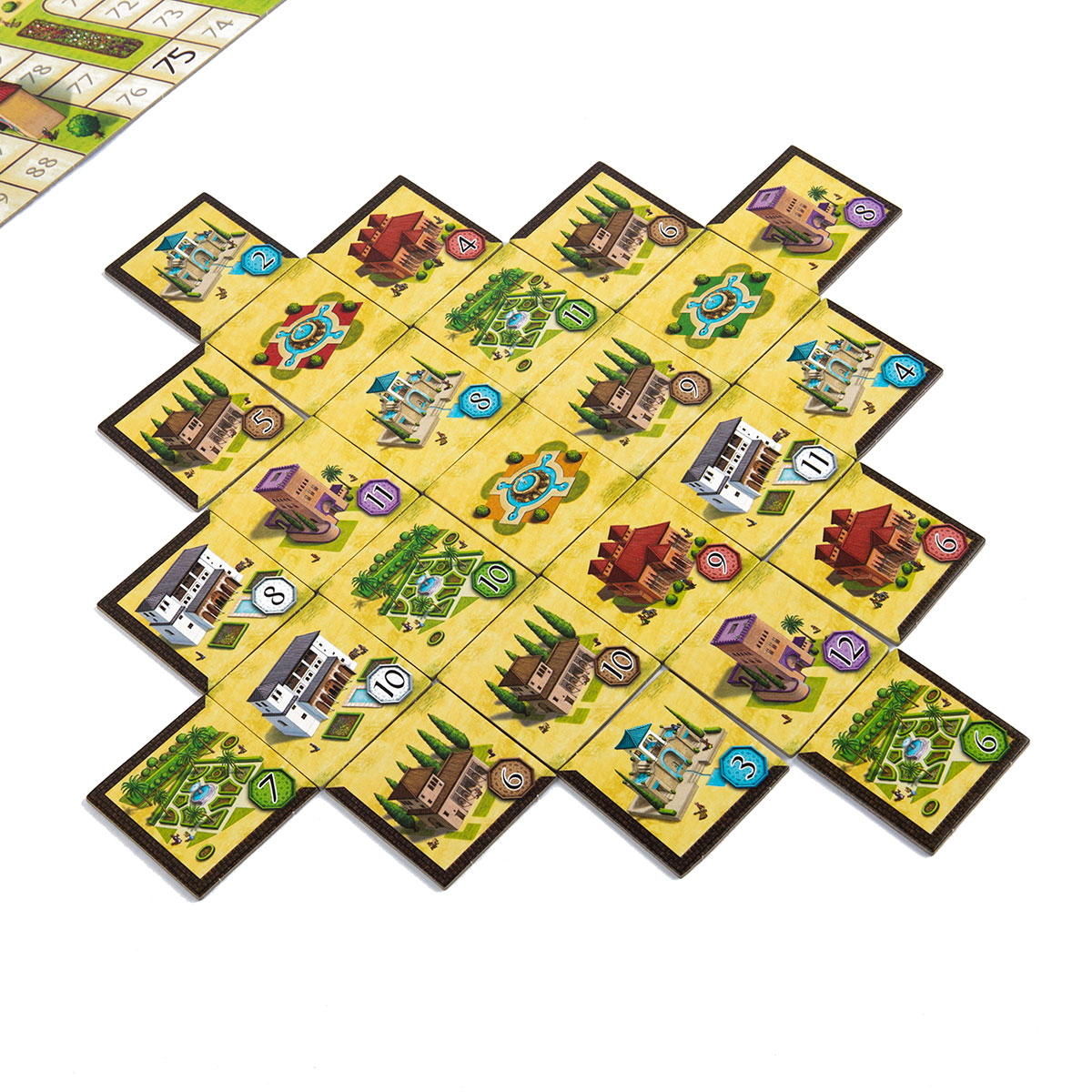 • 54 плитки 6 типов (сады, павильоны, башни, казармы, аркады, жилые постройки), каждая с ценой и сегментами стены.