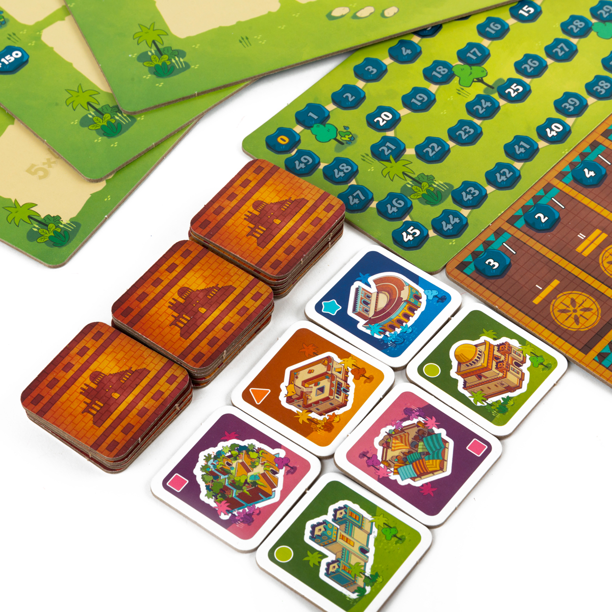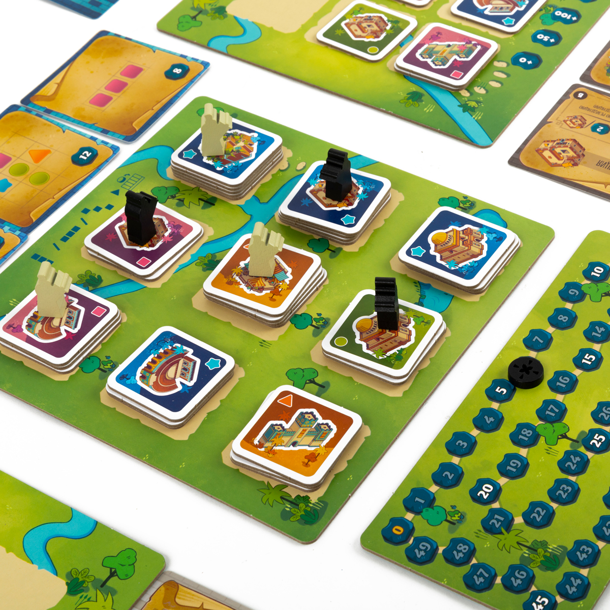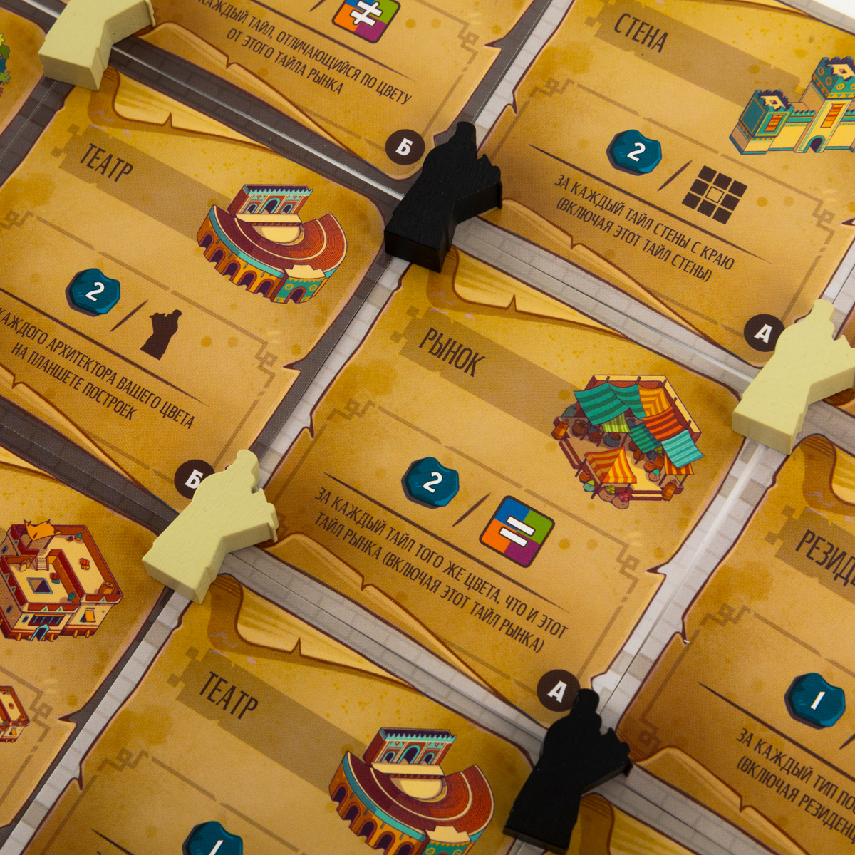 У каждого игрока есть собственный планшет города – сетка, на которую вы будете выкладывать тайлы построек, формируя кварталы и создавая удачные комбинации. В центре стола размещается общий планшет построек с несколькими стопками тайлов; рядом лежат планшет благосклонности царя и трек подсчёта очков. Каждый участник получает набор фигурок архитекторов и фишек своего цвета, а также стартовые карты проектов – цели, определяющие, как именно нужно расположить здания, чтобы получить дополнительные победные очки в конце партии.