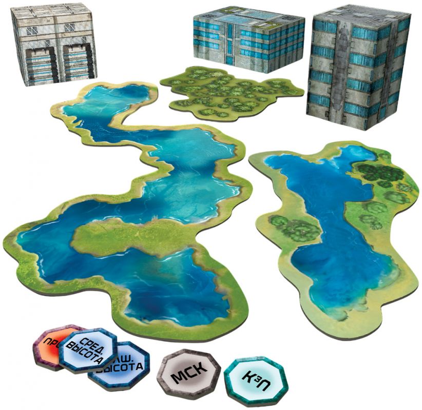 Главная ценность коробки — шесть блоков жетонов и двухсторонние элементы ландшафта. Сюда входят дополнительные деревья, жетоны целей и маркеры для расширенных правил движения и местности: реки, дороги, различные типы покрытия и области, влияющие на передвижение и огонь. Такой набор помогает быстро выкладывать на стол новые конфигурации карты, не рисуя их вручную и не полагаясь только на воображение игроков. Разнообразие жетонов позволяет моделировать городские кварталы, лесные массивы, открытые равнины, укреплённые рубежи и сложные «бутылочные горлышки».​