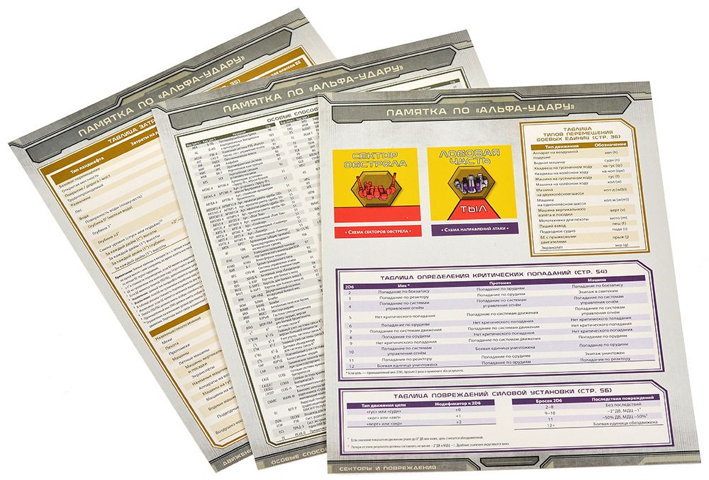 Три плотных двухсторонних листа с памятками по часто используемым правилам — ещё один практичный компонент. На них выведены ключевые таблицы и подсказки по режиму «Альфа-удар», которые обычно приходится искать в книге командира. Благодаря таким памяткам игроки реже отвлекаются на перелистывание страниц и быстрее принимают решения во время хода. Это особенно ощущается в партиях с несколькими участниками: меньше пауз — больше динамики боя и тактических решений.​