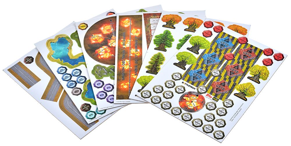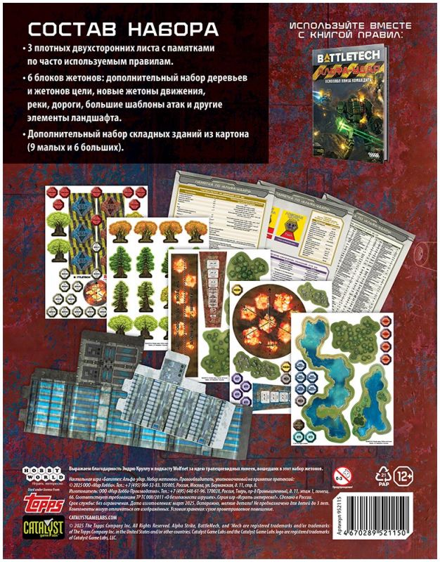 Набор дополнительно включает складные здания из картона — девять малых и шесть больших. Эти конструкции совместимы с теми, что входят в коробочный набор «BattleTech: Альфа-удар», и фактически увеличивают «городской» арсенал игроков: можно строить более крупные города, промышленные зоны и укреплённые базы. В обсуждениях Alpha Strike Counters Pack отмечается, что по содержанию он повторяет базовые здания и деревья из стартового набора, добавляя к ним новые маркеры местности и вспомогательные элементы. Это особенно ценно, если у вас уже есть миниатюры и правила, но не хватает объёмного окружения для поля боя.​
