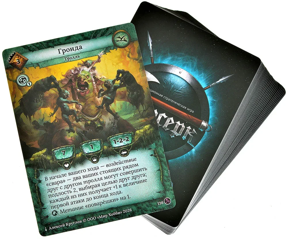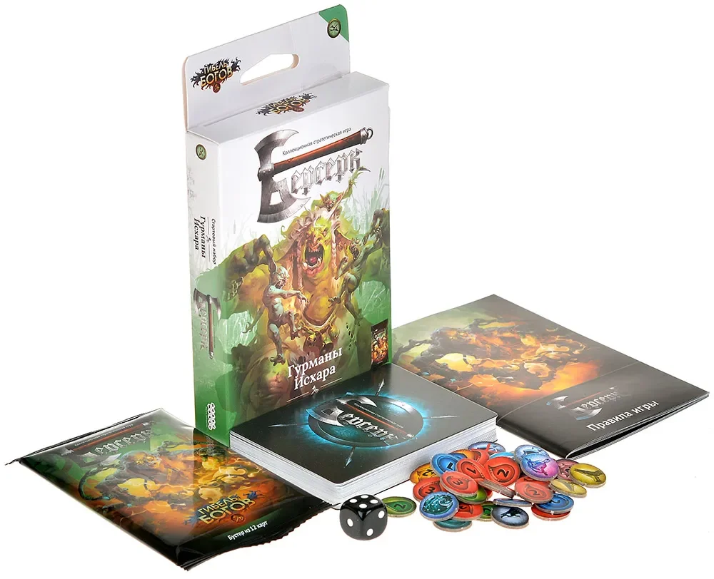 В комплект стартового набора входят не только карты, но и всё необходимое для отслеживания происходящего на поле. Вы получите жетоны ран и эффектов, кубик, а также памятку с таблицей ударов, которая помогает быстро интерпретировать результаты бросков — особенно полезно для новичков и тех, кто давно не играл. Правила, вложенные в коробку, поясняют базовые механики «Берсерка», структуру хода и особенности работы карт сета «Гибель богов», так что можно начать игру, просто распаковав набор и прочитав буклет.
