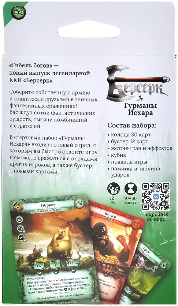 «Гурманы Исхара» рассчитаны на дуэльные партии: для полноценной игры нужен второй стартовый набор (например, «Изгнанники Алламора» или «Жнецы Хаосфортума») либо уже собранная колода соперника. Стандартные параметры выпуска «Гибель богов» сохраняются: играют 2 человека, рекомендованный возраст — от 12 лет, а средняя партия занимает примерно 40–60 минут в зависимости от опыта и состава колод. Набор относится к линейке «Начинающим игрокам», поэтому подойдёт и тем, кто только знакомится с «Берсерком», и тем, кто возвращается в игру после перерыва.