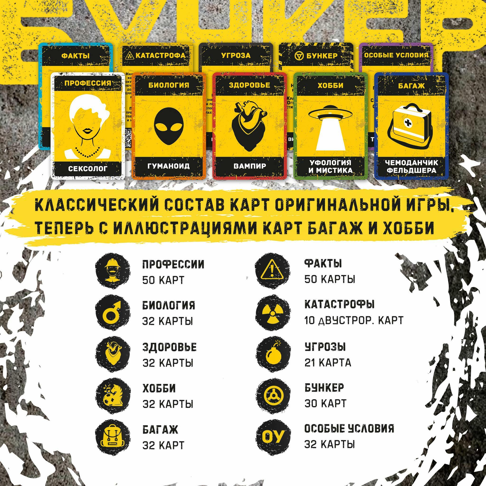 Игра "Бункер", 3-е издание – дискуссионная игра о выживании после апокалипсиса. Игра 18+ (в игре содержатся упоминания секса, смерти, алкоголя).