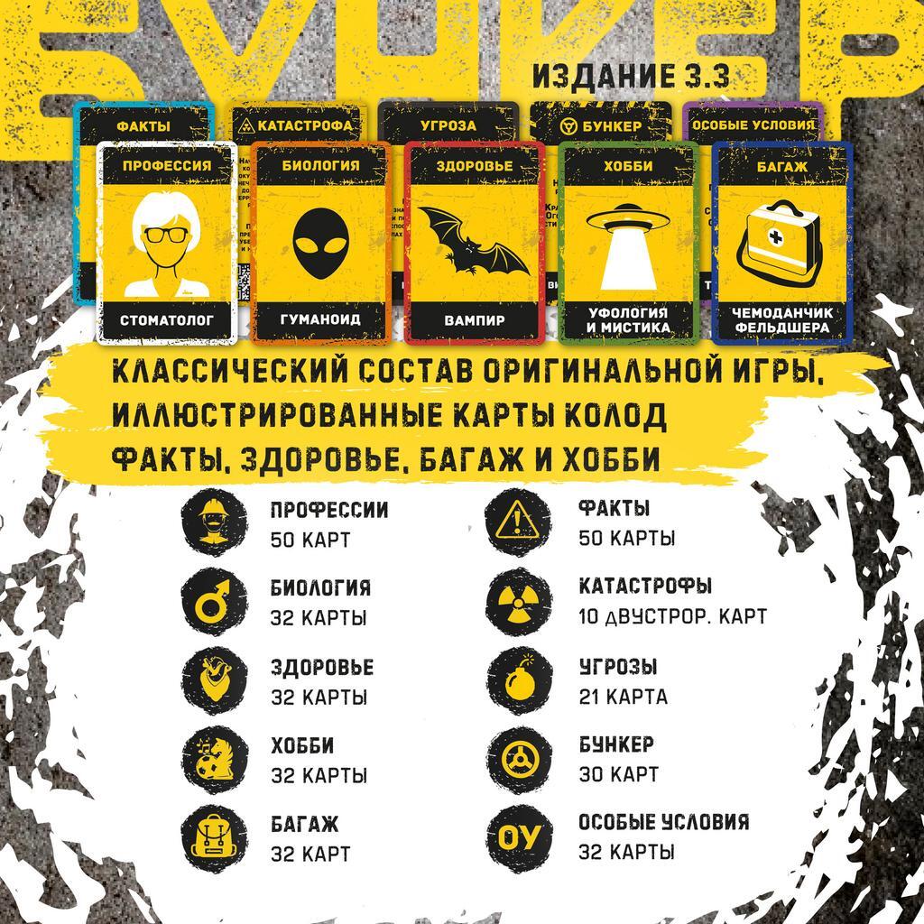 Особенность издания «Бункер» 3.3 – это обновлённые, иллюстрированные колоды и актуальные карты. В этой версии присутствуют уникальные иллюстрации на всех картах «Багаж», «Хобби», «Факты» и «Здоровье», что делает набор персонажей более наглядным и атмосферным. В комплект также входит карта «Кода доступа», а часть карт была переработана по сравнению с предыдущими версиями, что освежает партии и добавляет вариативности.