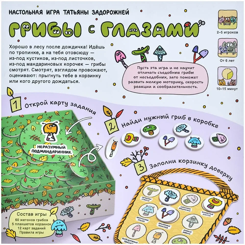 Благодаря компактной коробке и простому набору компонентов «Грибы с глазами» удобно взять с собой в гости или на дачу. Игра поддерживает от 2 до 5 участников, поэтому одинаково хорошо работает и в дуэли, и в шумной компании. Если вы ищете динамичную детскую игру с понятными правилами, милыми иллюстрациями и активным взаимодействием за столом, «Грибы с глазами» станет отличным выбором для вашей коллекции.
