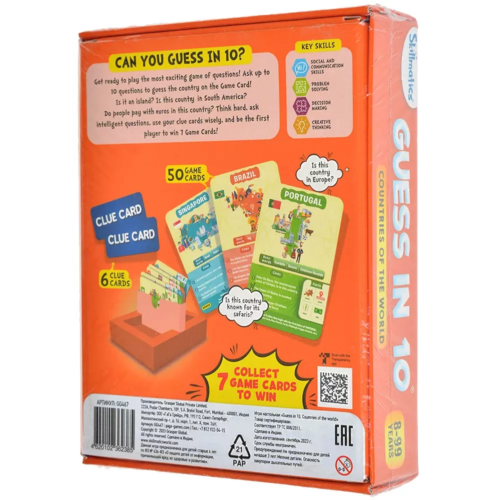 Guess in 10: Countries of the World изначально задумана как образовательная игра. Каждая из 50 карт стран содержит не только название, но и набор интересных фактов – всего более 300 небольших сведений: регион, форму правления, особенности природы, языка, валюты и т.п. По мере игры дети и взрослые запоминают, где находится та или иная страна, чем она выделяется и какие ассоциации с ней связаны.