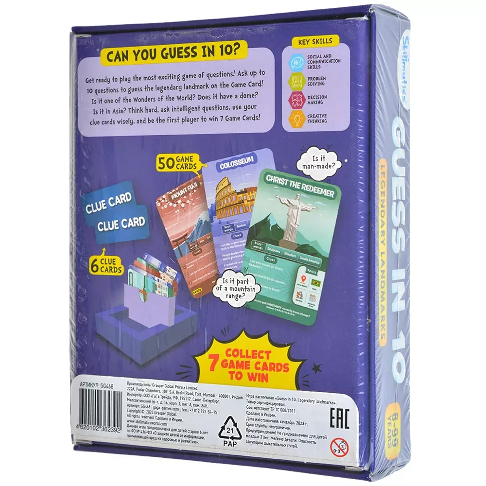 Guess in 10: Legendary Landmarks – динамичная семейная викторина, в которой участники пытаются отгадать легендарную достопримечательность, задавая максимум десять вопросов с ответами «да» или «нет». В колоде собраны знаменитые места со всего мира – от чудес света до природных объектов, поэтому игра одновременно развлекает и расширяет кругозор.