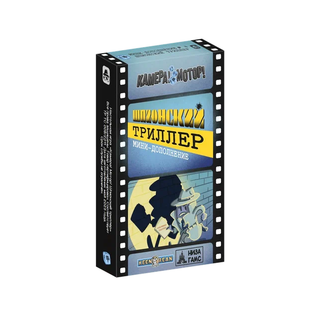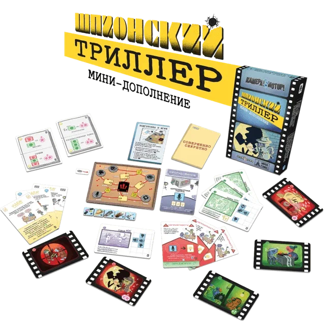 «Камера! Мотор! Шпионский триллер» – мини‑дополнение к кооперативной игре «Камера! Мотор!», посвящённое съёмкам напряжённого шпионского боевика. Ваша киностудия всё так же балансирует на грани банкротства, но теперь ставка сделана на фильм о двойных агентах, секретных операциях и утечках информации, где доверять нельзя никому. Дополнение добавляет новые компоненты и небольшое изменение правил, усиливая атмосферу паранойи и конспирации на съёмочной площадке.​