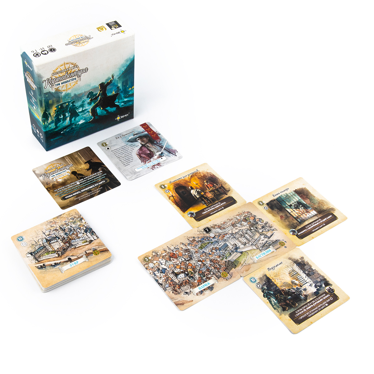 Тематика игры — приключенческая и историческая. В коробке вы найдёте дополнительный буклет с исторической справкой о времени, в которое вас переносит сюжет: Франция времён кардинала Ришельё, придворные интриги, дуэли, честь и долг. Это делает игру не только развлекательной, но и познавательной: после партии хочется перечитать роман или посмотреть экранизацию, чтобы сравнить свой «путь» с классической историей.