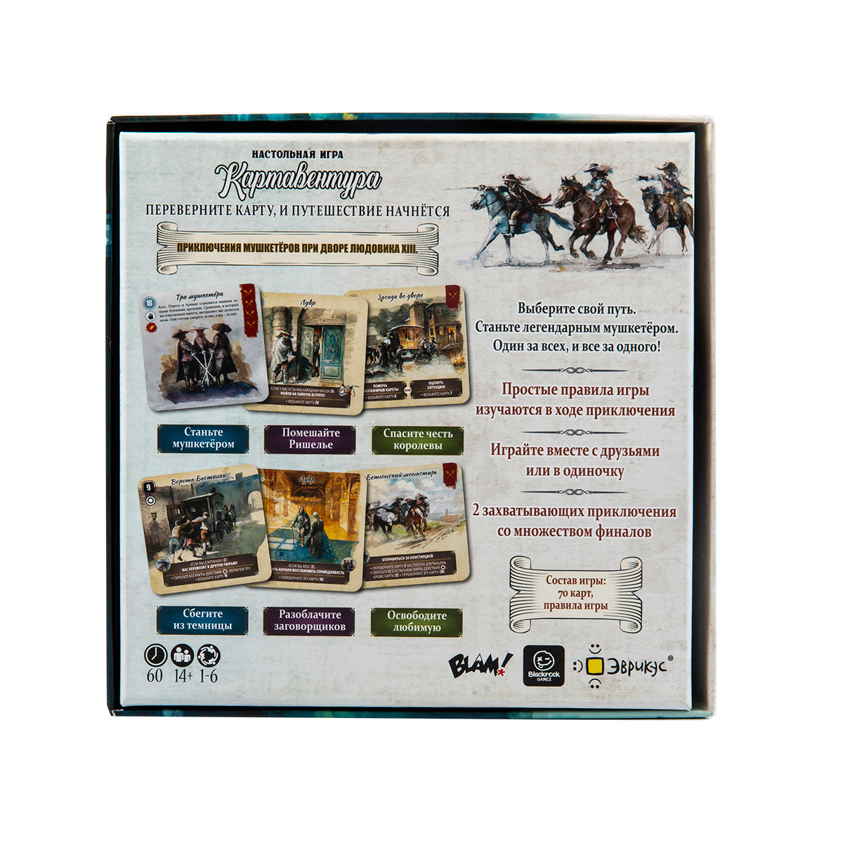 «Картавентура. Три мушкетёра» рассчитана на игроков от 14 лет, любит вдумчивое чтение и совместные обсуждения. Она подойдет любителям сторителлинговых игр, квестов, кооперативных приключений и тем, кто ищет компактную коробку с большим количеством текста и атмосферных иллюстраций. Это отличный выбор для вечера вдвоём, семейного чтения с подростками или дружеской компании, которой хочется «посмотреть» фильм по Дюма, но в формате настольной истории, где финал зависит от них самих.