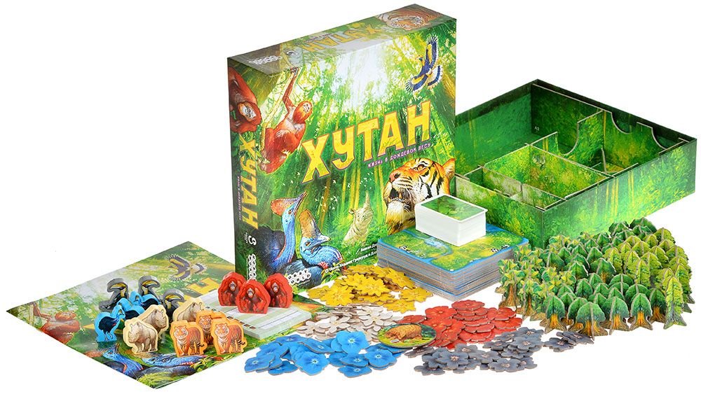 Отдельное внимание уделено визуальной стороне: большое количество цветных элементов – 130 цветов, 64 объёмных дерева и фигурки животных – превращают партию в медитативный творческий процесс. Игроки не просто двигают абстрактные жетоны, а буквально «строят» красивый уголок природы, наблюдая, как лес приобретает форму и характер. Благодаря этому «Хутан» хорошо подходит и как настольная игра, и как эффектное украшение стола во время партии: финальные поля игроков выглядят впечатляюще и запоминаются.