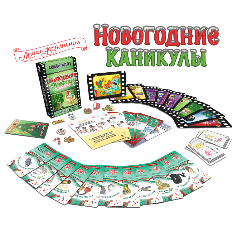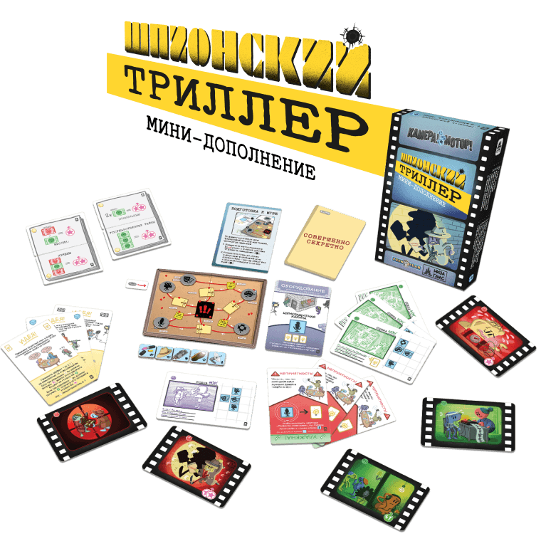 «Новогодние каникулы» превращают съёмочную площадку в атмосферный праздничный сет с гирляндами и подарками. Дополнение добавляет 10 новогодних сцен, 12 карт подарков, 3 карты духов Рождества, трек праздничного настроения и жетоны зимнего декора, а от игроков требует не только контролировать бюджет, но и поддерживать боевой дух команды в разгар каникул. «Шпионский триллер» вводит Доску заговоров и трек утечек информации, 10 шпионских сцен, новые идеи и неприятности, усиливая ощущение скрытых интриг и риска провала секретной операции.