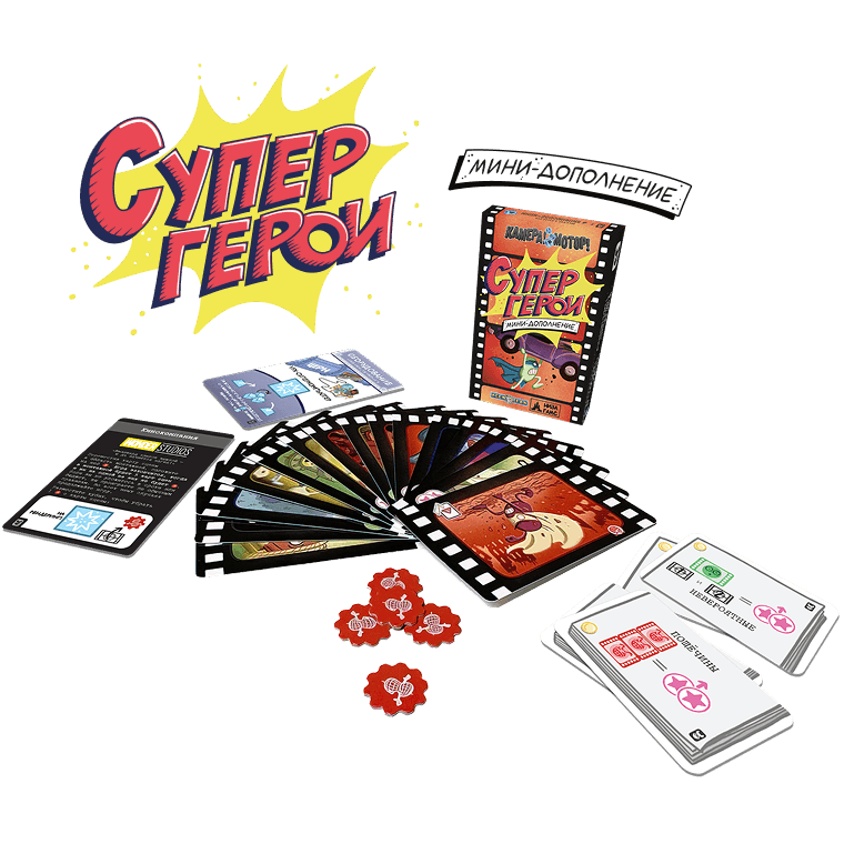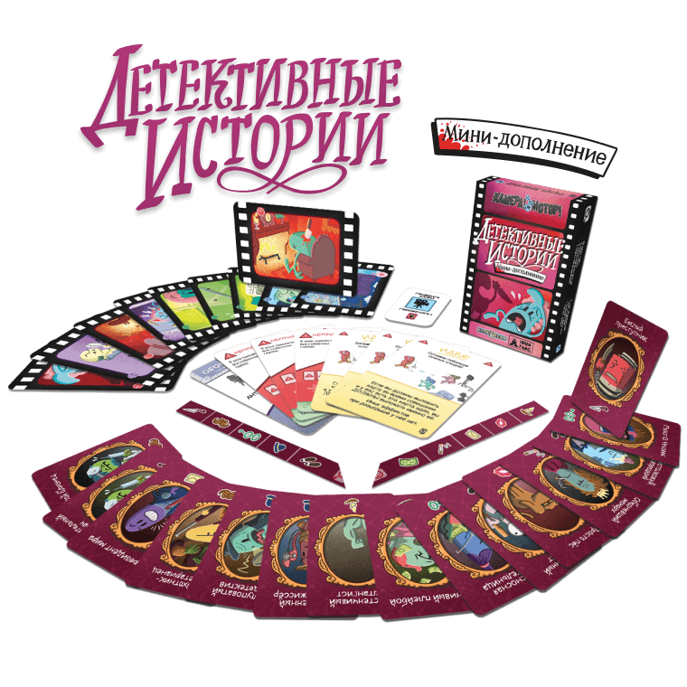 Каждое мини‑дополнение вносит в игру свою маленькую, но ощутимую механику и набор тематических карт. «Супергерои» добавляют новый сценарий, 15 карт сцен с супергеройскими эпизодами, карту кинокомпании, карту оборудования и жетоны компьютерной графики, подчёркивающие масштабность спецэффектов. «Детективные истории» приносят в студию 10 детективных сцен, 15 карт подозреваемых, улики и планшеты реквизита, позволяя по ходу съёмок собирать доказательства и шаг за шагом вычислять преступника.