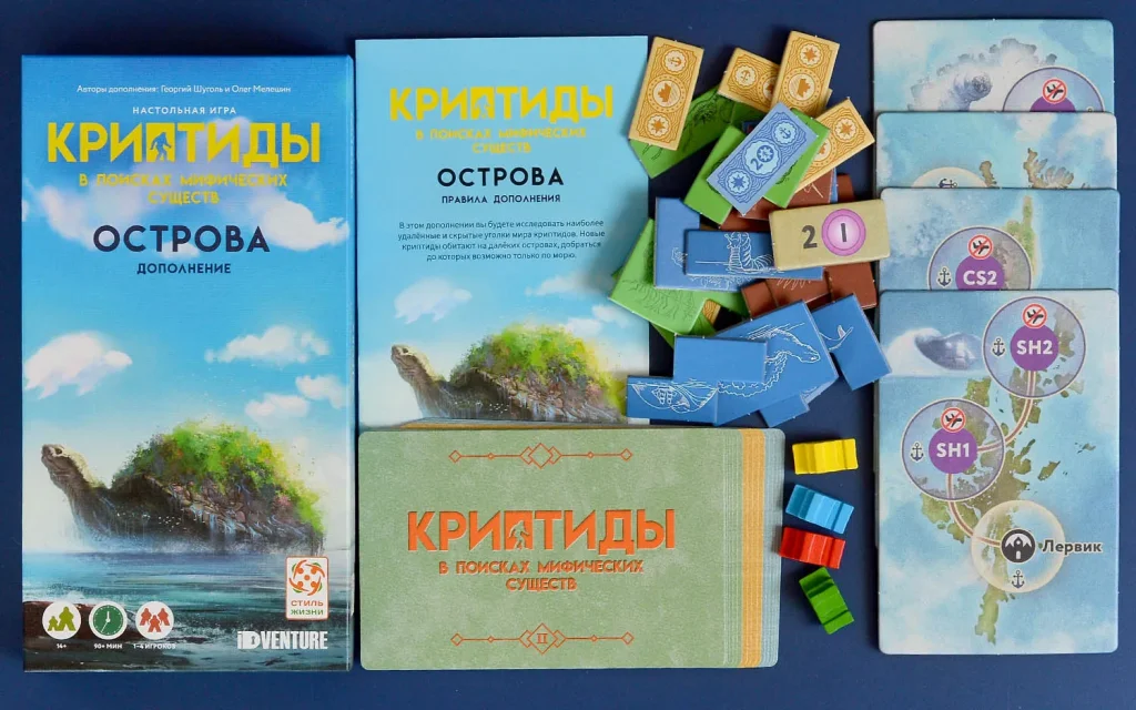 Важно: на странице прямо сказано, что продукт не является самостоятельным. Для использования дополнения нужна базовая версия «Криптиды: В поисках мифических существ», именно она содержит все базовые компоненты – игровое поле Европы, заповедник, основные карты криптидов и контрактов, жетоны ресурсов, фигурки криптозоологов и помощников. «Острова» привносят дополнительные карты, тайлы и фишки, которые встроены в уже существующую систему, а не заменяют её.