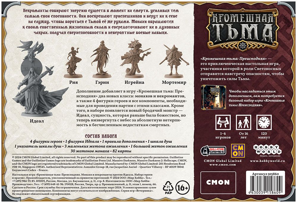 Дополнение добавляет в игру "Кромешная тьма: Преисподняя" два новых класса: монахов и некромантов, а также 4 фигурки героев и все компоненты, необходимые для проведения партии с этими классами. Кроме того, в наборе появляется новый бродячий монстр – Идеал, сущность, которая раньше была божеством, но теперь низвергнута с небес за абсолютную нетерпимость к бесчисленным недостаткам смертных.