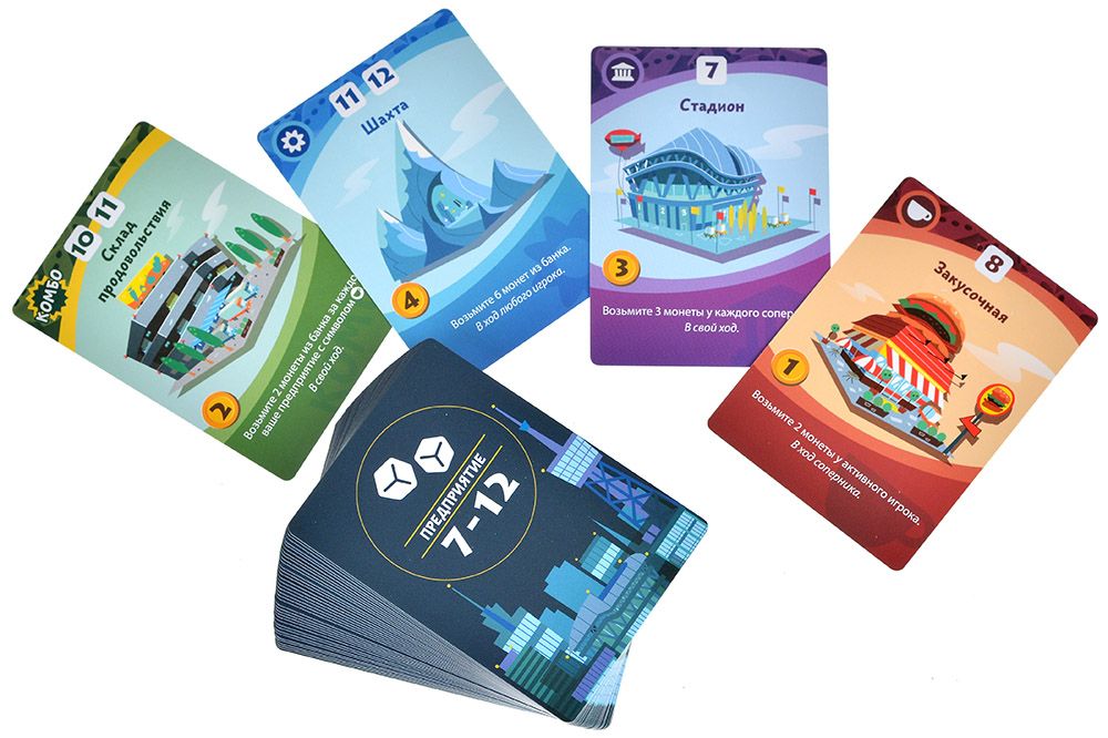 - Стартовая фаза (3 раунда): Игроки по очереди покупают одно предприятие без броска кубика
