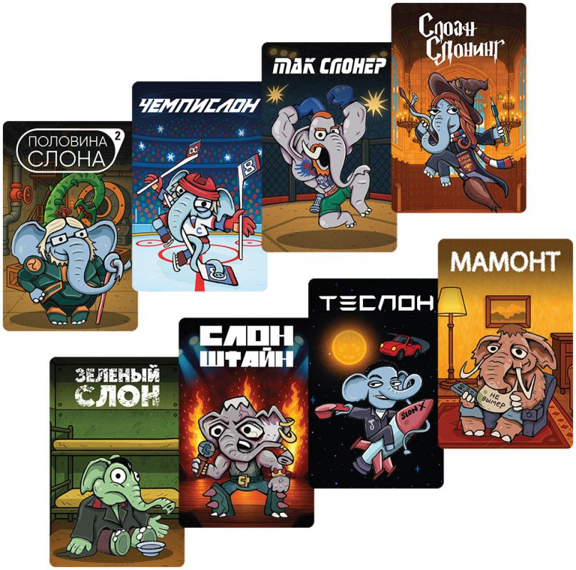 В коробке вас ждут 28 карт со Слонярами с яркими иллюстрациями и именами, которые можно запоминать или придумывать свои. Игровой процесс строится вокруг запоминания порядка карт и командного поиска совпадений, а атмосфера держится на добром юморе и постоянных репликах: «Это наш Слоняра или не наш?».