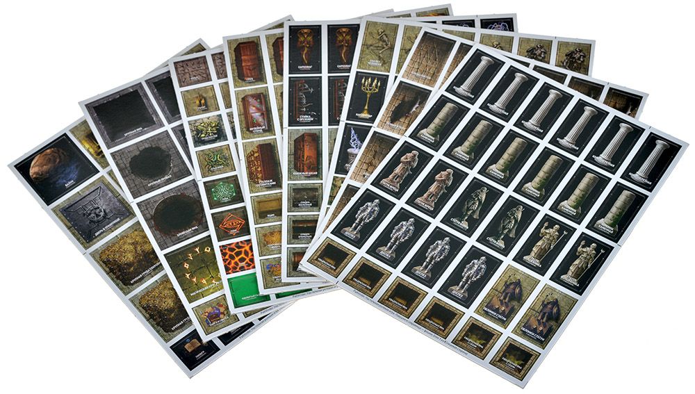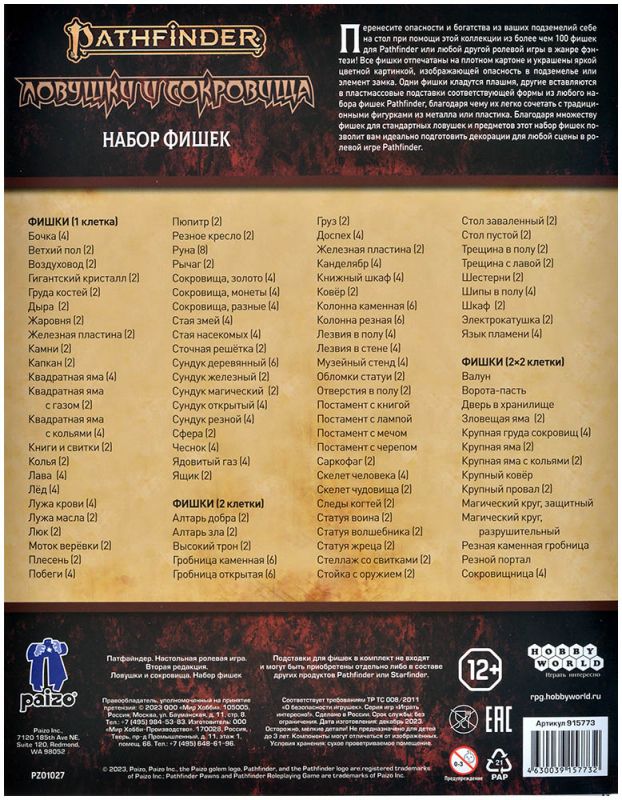 Перенесите опасности и богатства из ваших подземелий себе на стол при помощи этой коллекции из более чем 100 фишек для Pathfinder или любой другой ролевой игры в жанре фэнтези! Все фишки отпечатаны на плотном картоне и украшены яркой цветной картинкой, изображающей опасность в подземелье или элемент замка. Одни фишки кладутся плашмя, другие вставляются в пластмассовые подставки соответствующей формы из любого набора фишек Pathfinder, благодаря чему их легко сочетать с традиционными фигурками из металла или пластика. Благодаря множеству фишек для стандартных ловушек и предметов этот набор фишек позволит вам идеально подготовить декорации для любой сцены в ролевой игре Pathfinder.
