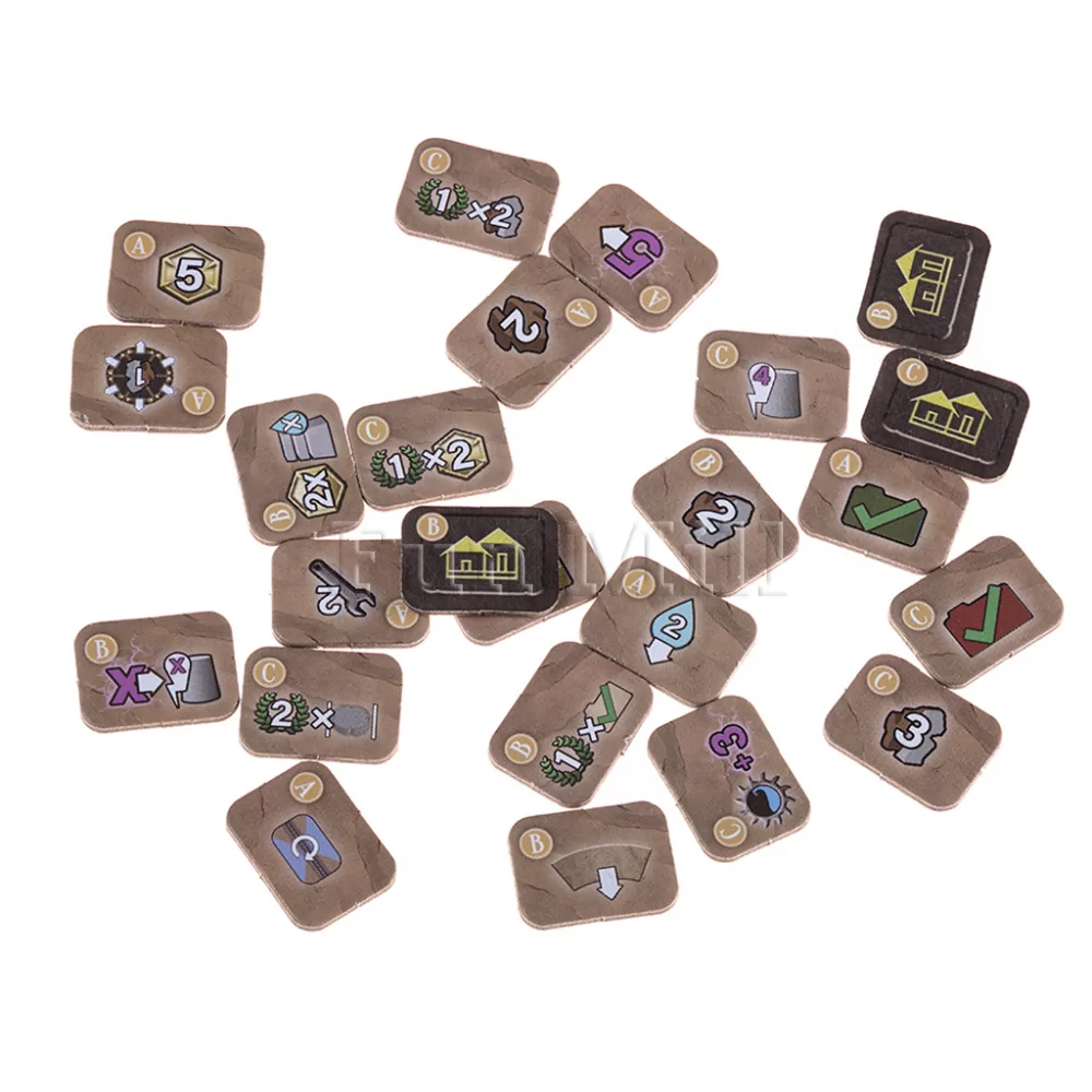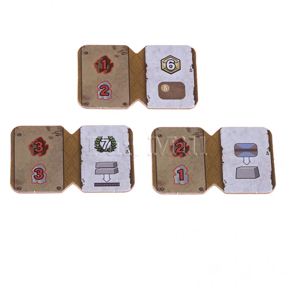 • Жетоны рабочих посёлков — стартовые точки, которые мостами соединяют с областями действий, формируя сеть логистики.