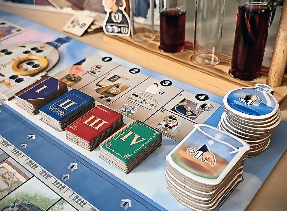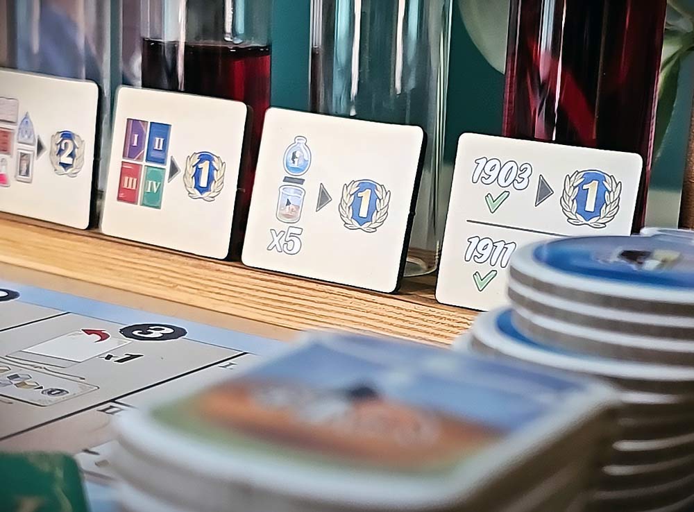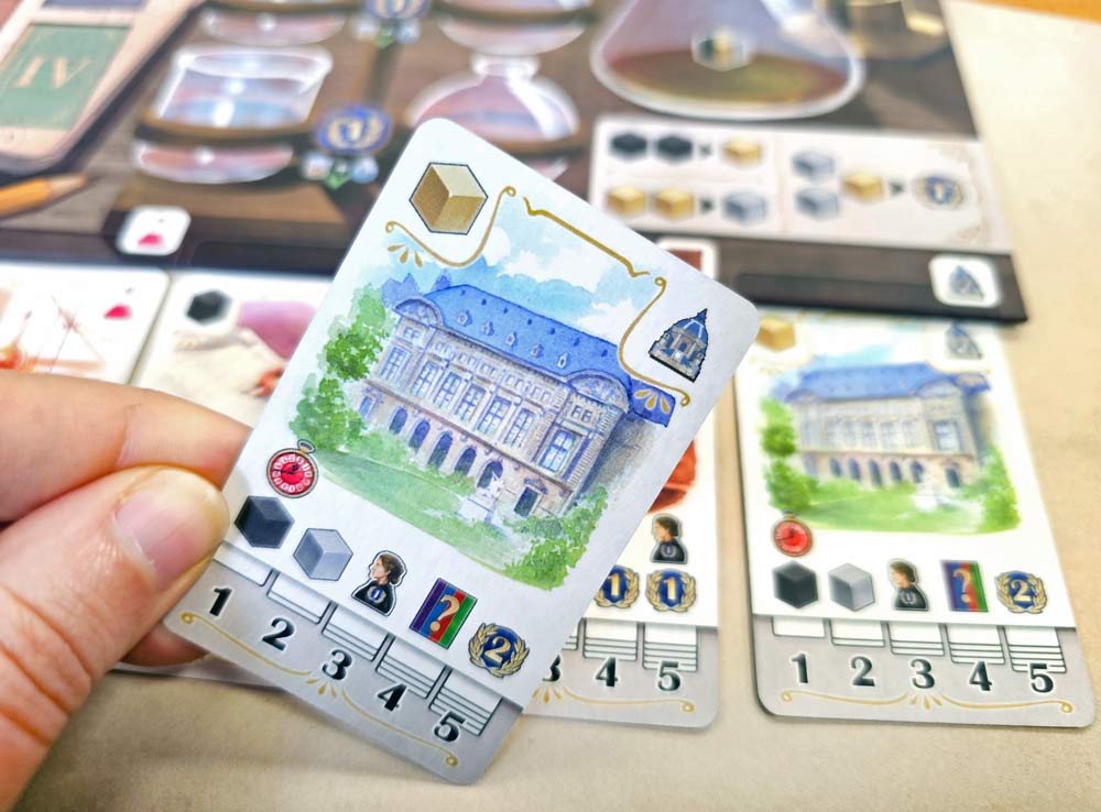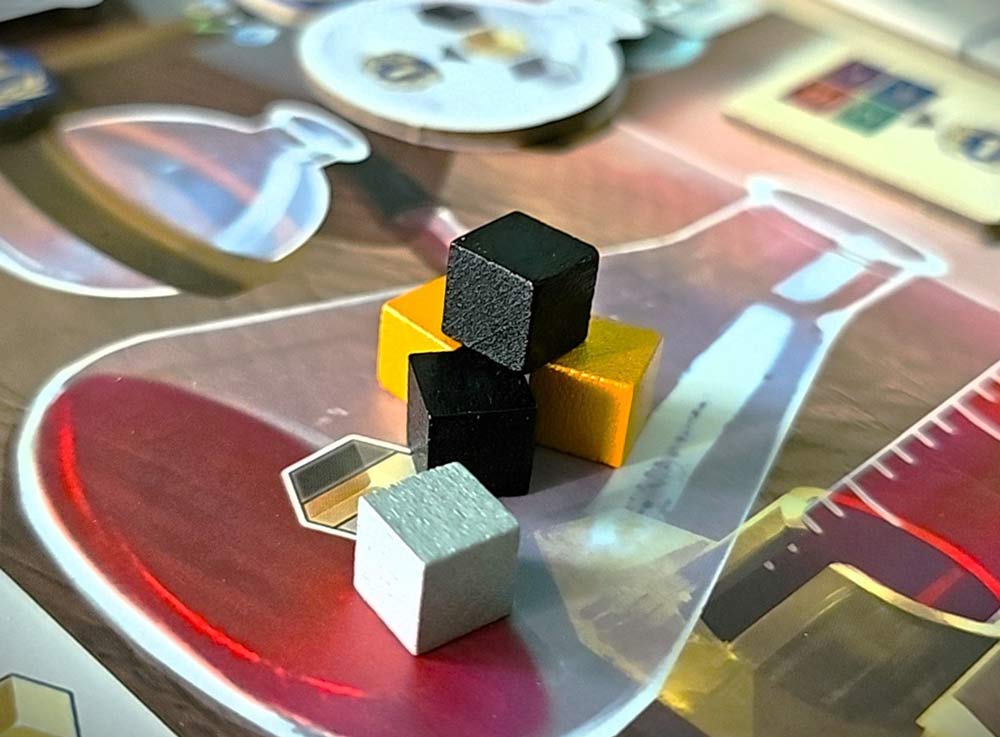 Вы будете собирать ресурсы, покупать карты действий, повышать лимиты лаборатории и двигаться по треку научных достижений.
