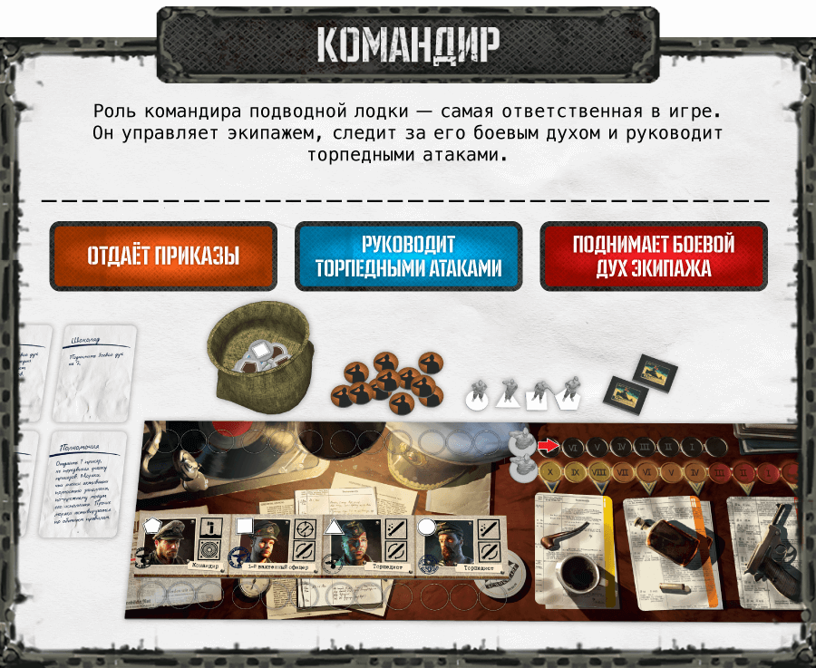 Экипаж командира несёт ответственность за все этапы проведения торпедных атак: погрузку торпед в торпедные аппараты, заполнение их водой, прицеливание и запуск снарядов. За каждый отданный приказ командир передвигает на 1 деление фишку по шкале приказов. Если фишка достигнет последнего деления этой шкалы, командир будет вынужден использовать фишку на шкале боевого духа экипажа, понижая его. Падение боевого духа грозит неприятными последствиями, указанными на картах боевого духа. Положение фишки на шкале приказов обновляется при каждой смене вахт, а вот боевой дух можно поднять, только уничтожая противника или с помощью специальных карт командира. Падение боевого духа до нуля крайне опасно для экипажа и может привести к гибели всей команды, что, несомненно, является поражением в игре.