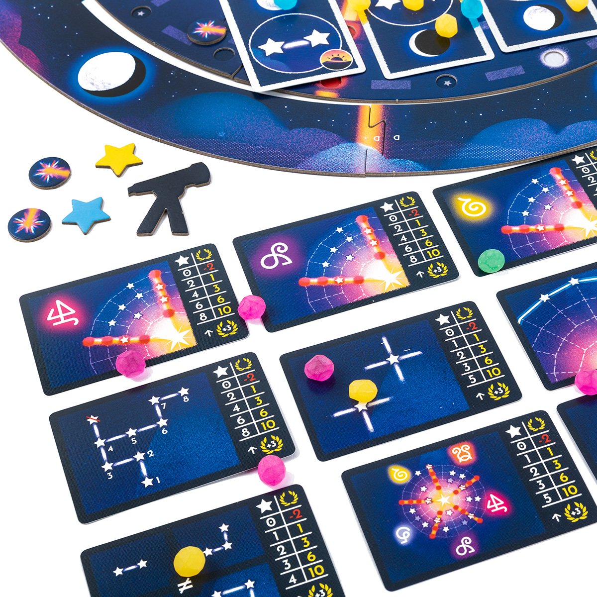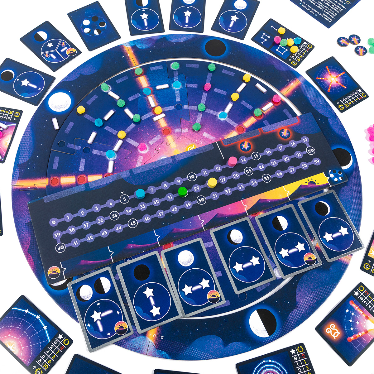 Размещая звёзды, важно учитывать фазу Луны, активную в текущем раунде. Именно она показывает, в каких областях звёздного неба вам разрешено выкладывать новые фишки. Звёзды можно ставить как в белые ячейки внутри сектора, так и на красные точки на границах секторов: такие позиции гибче, но за них приходится платить жетонами падающих звёзд. Линии созвездий соединяют отдельные звёзды и часто становятся ключевым элементом для выполнения целей и набора очков.
