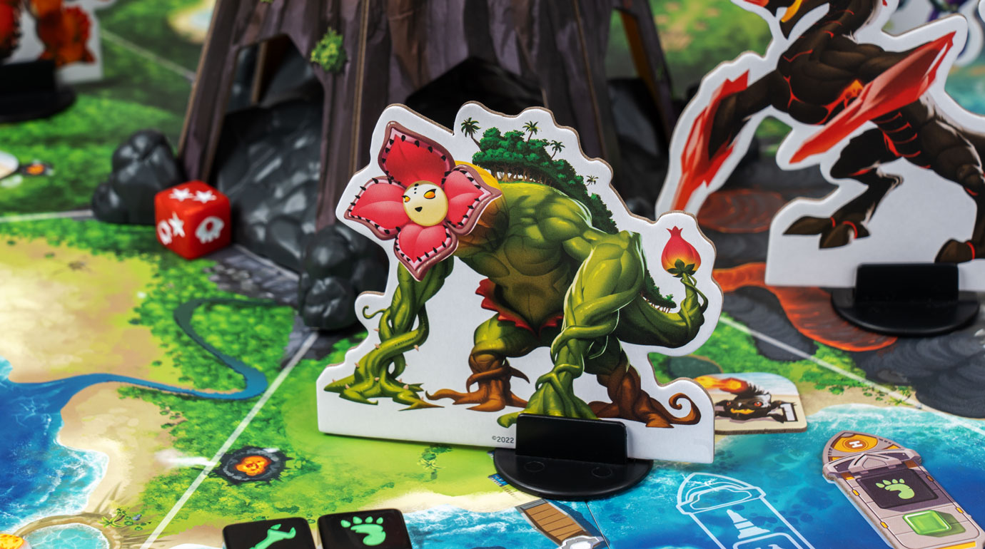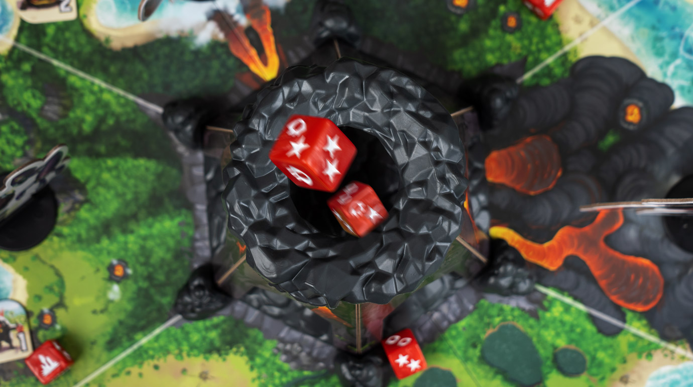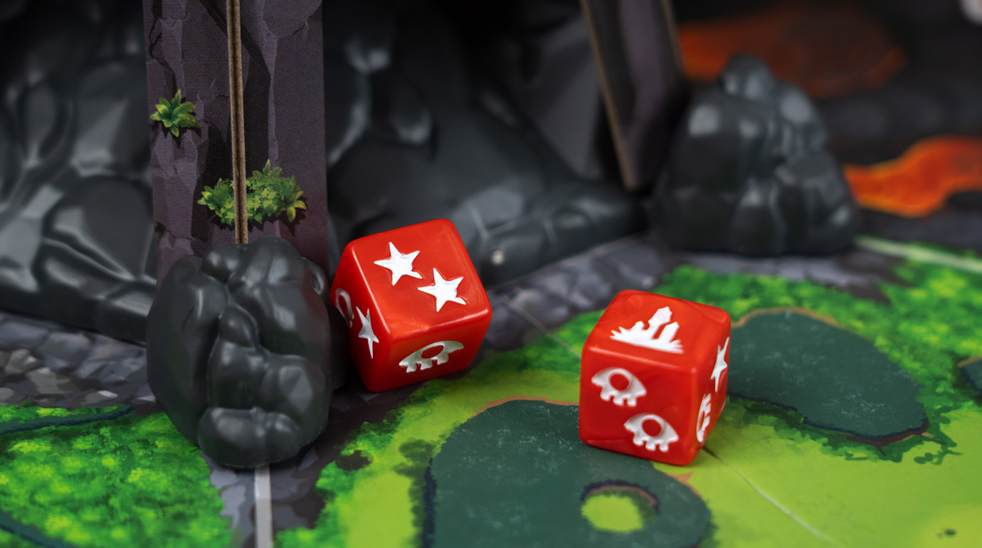 В фазу босса активируйте его свойство, а затем бросьте доступные красные кубики в вулкан в центре острова — он случайно распределит кубики по полю, а босс переместится в соседнюю зону с наибольшим количеством кубиков. Там же активируются прислужники, и эти несносные малыши принесут вам немало неприятностей — например, защитят своих коллег, нанесут урон или возведут пару новых сверкающих кристаллов. Наконец, активируются кубики босса, прокачивая его свойства, призывая новых прислужников и укрепляя кристаллы, которые вот-вот превратятся в монолиты и запустят открытие портала…