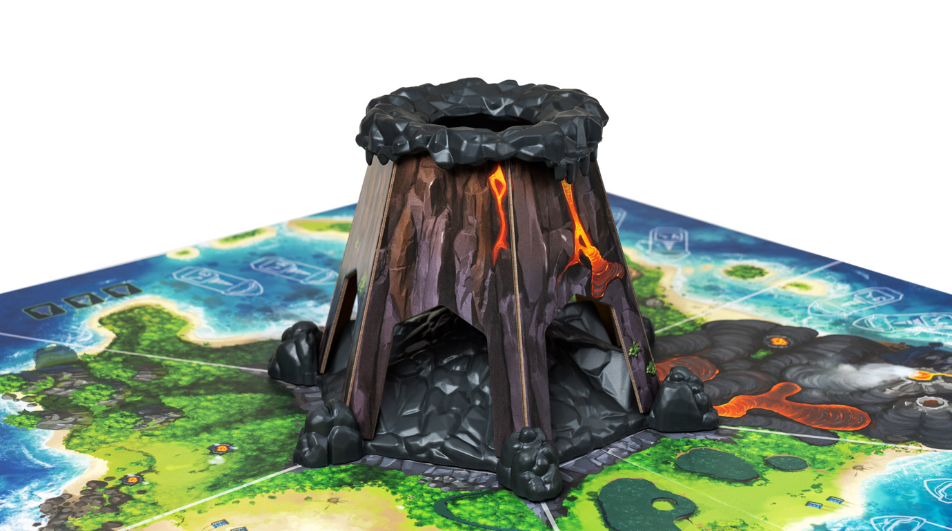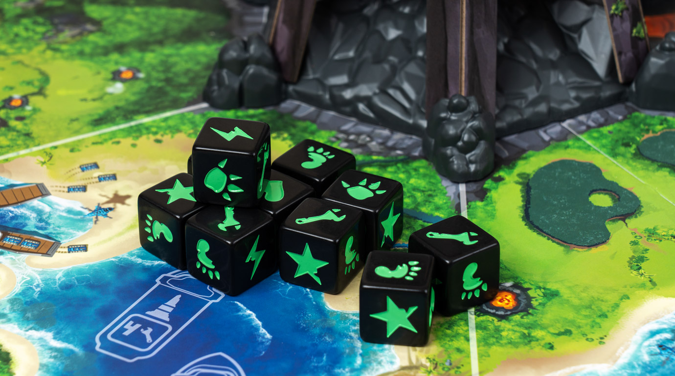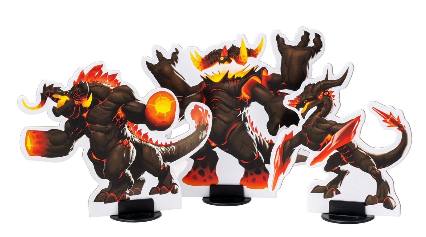 В фазу босса активируйте его свойство, а затем бросьте доступные красные кубики в вулкан в центре острова — он случайно распределит кубики по полю, а босс переместится в соседнюю зону с наибольшим количеством кубиков. Там же активируются прислужники, и эти несносные малыши принесут вам немало неприятностей — например, защитят своих коллег, нанесут урон или возведут пару новых сверкающих кристаллов. Наконец, активируются кубики босса, прокачивая его свойства, призывая новых прислужников и укрепляя кристаллы, которые вот-вот превратятся в монолиты и запустят открытие портала…