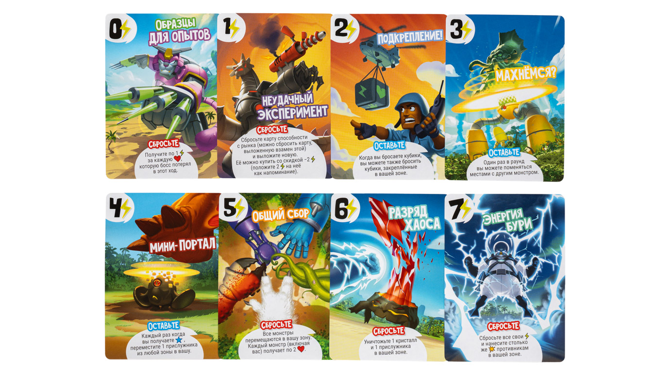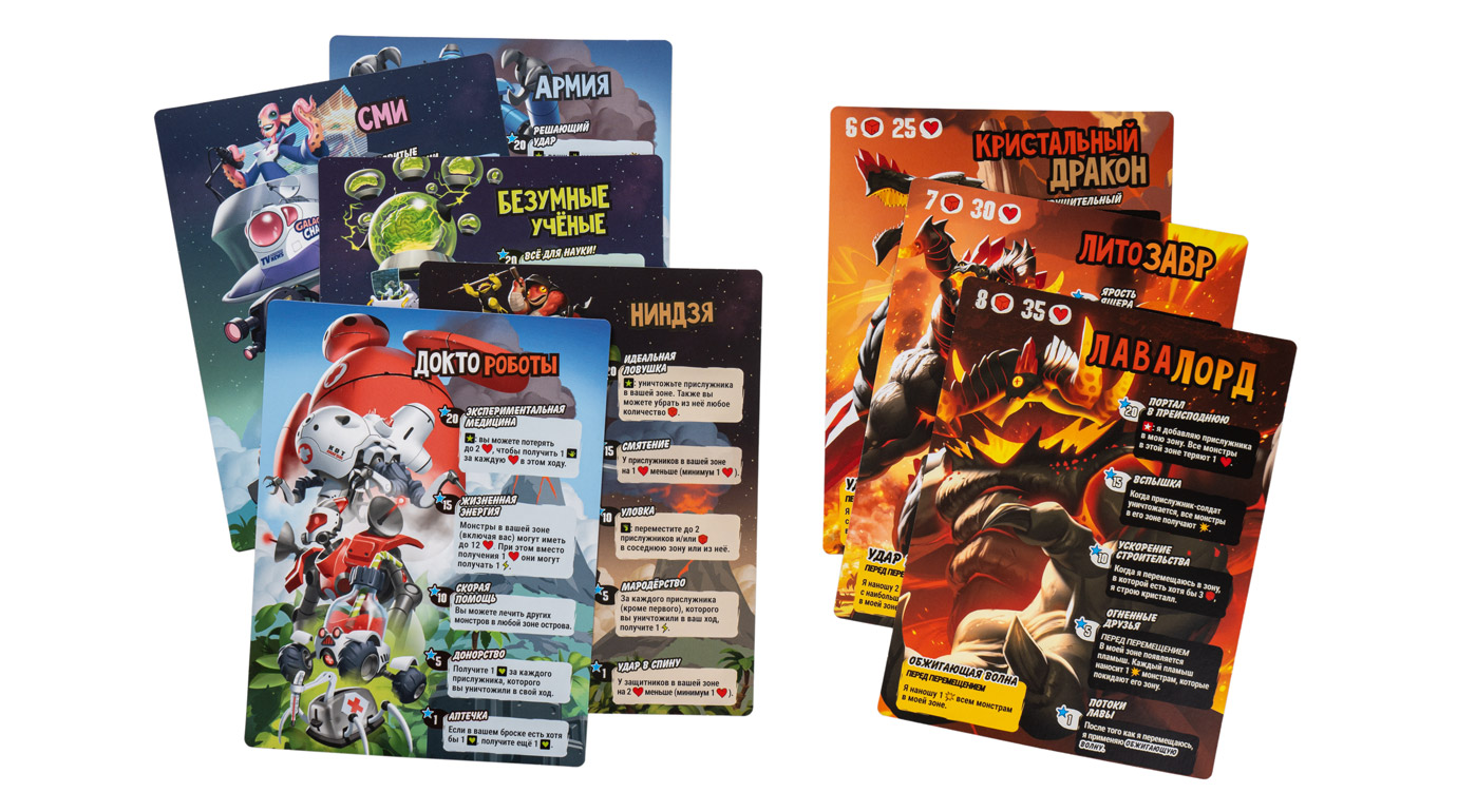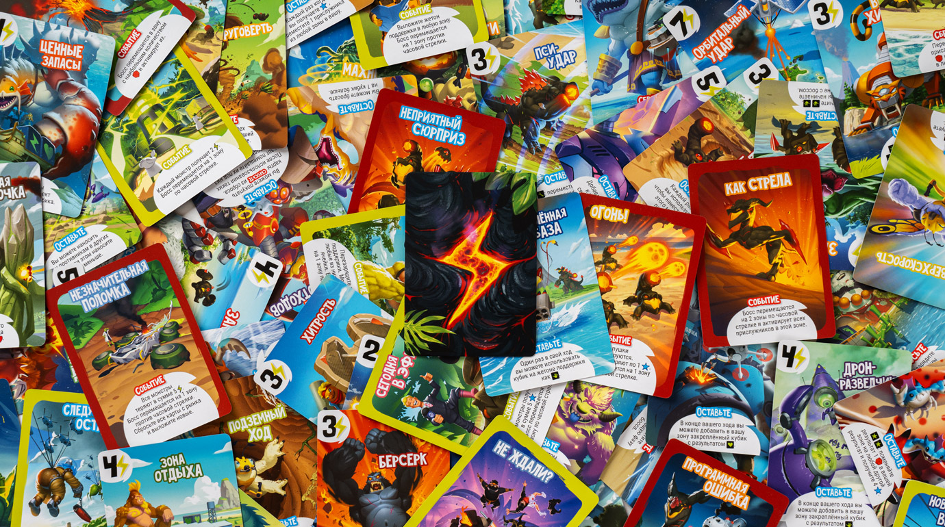 В фазу монстра игроки наносят ответный удар — пора бросить свои 6 кубиков! Разыгрывайте их эффекты в любом порядке: получите энергию или очки популярности, поднимите здоровье или переместите любого монстра, добавьте на поле жетон поддержки или нанесите урон врагу в своей зоне. Кубики можно дважды перебросить, чтобы собрать подходящую комбинацию, но ещё лучше — делиться ими с сокомандниками. Оказавшийся в нужный момент под рукой кубик может не только помочь товарищам, но и перевернуть ход даже самой непростой партии.