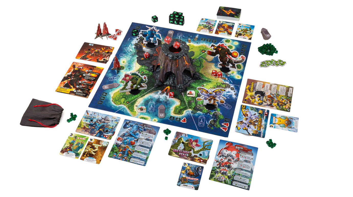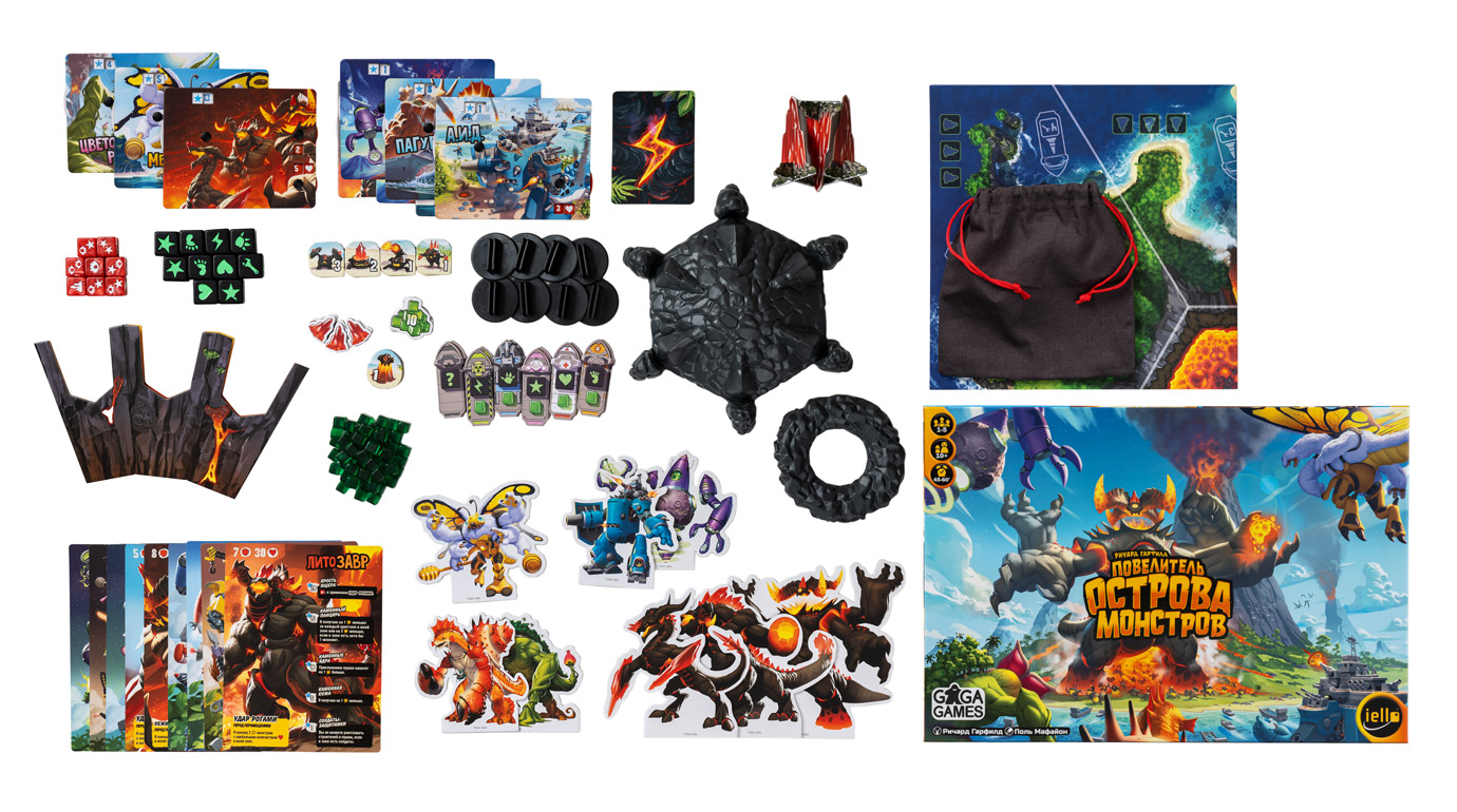 Повелитель Острова Монстров — всё та же чертовски азартная кубометательная игра, но теперь к безбашенному рандому, ярким иллюстрациям от Поля Мафайона и эффектным битвам добавились новые механики, море взаимодействия и непростой выбор на каждом шагу. Наполнение этой коробки тоже внушительное: большие фигурки монстров, несколько ужасающих боссов, огромное раскладное поле, кастомные кубики и пластиковая башня-вулкан!