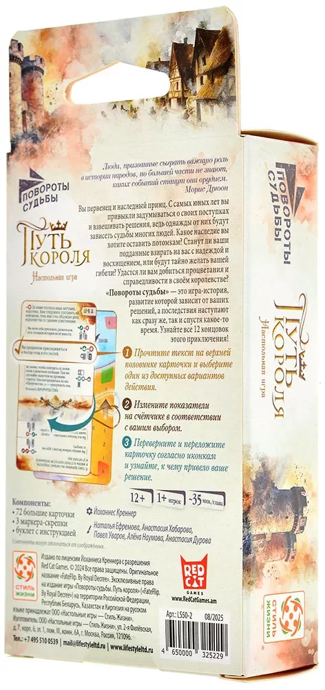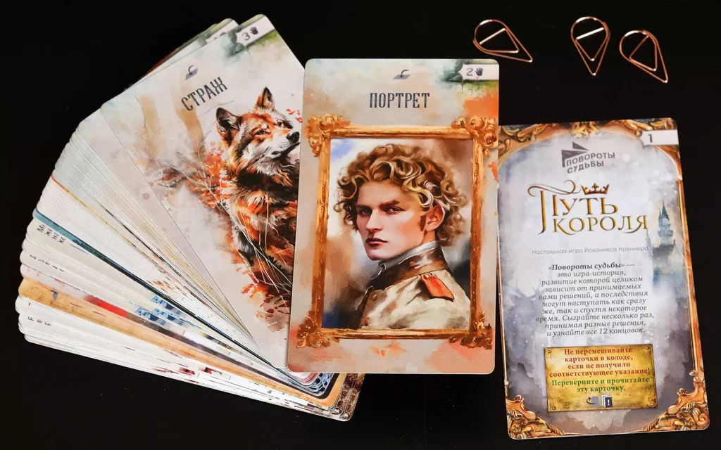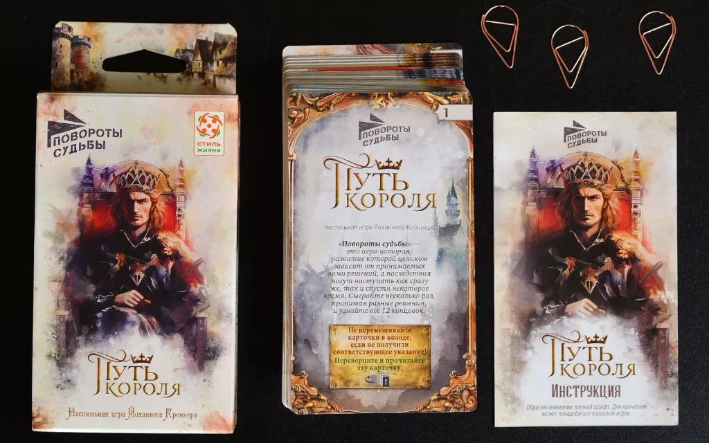 «Повороты судьбы: Путь короля» рассчитана прежде всего на одного игрока, рекомендованный возраст — от 14 лет, а средняя партия занимает около 45 минут. Правила несложные, акцент сделан на чтении и выборе, поэтому игра напомнит интерактивный роман или игру-книгу, но в более компактном, карточном формате. Благодаря атмосферным иллюстрациям в технике акварели и продуманной подаче текста вы легко погружаетесь в мир средневекового королевства, где от одних и тех же ситуаций можно прийти к очень разным судьбам.