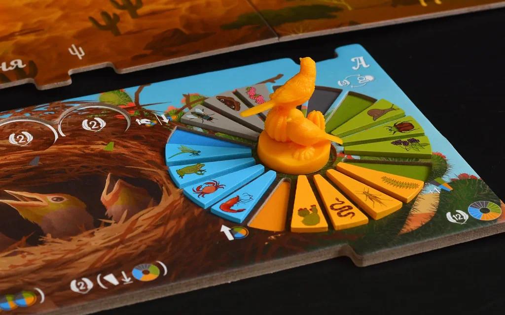 Корм представлен жетонами разных типов – насекомые, семена, рыба и другие виды провизии, характерные для конкретных биомов. Собирая эти жетоны, вы не просто пополняете запас пищи, но и формируете наборы, необходимые для кормления птенцов и выполнения целей. На личном планшете каждый игрок размещает сегменты биомов и собранные жетоны так, чтобы закрывать условия карт целей и получать за это победные очки.