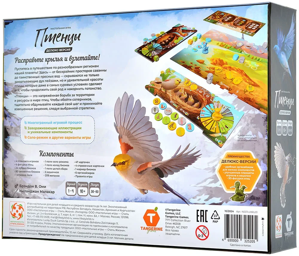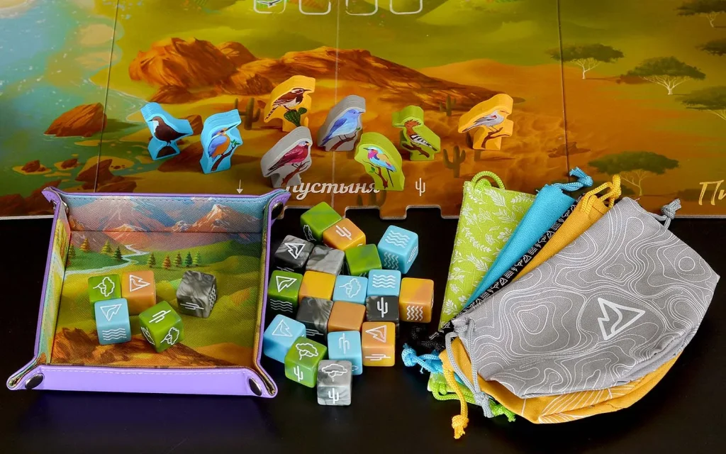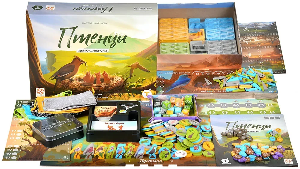 Делюкс-версия «Птенцов» отличается улучшенными компонентами. В комплект входят 3D‑фигурки птиц, дополнительно к деревянным миплам, шесть пластиковых органайзеров, удобный лоток для броска кубиков и увеличенное количество жетонов и аксессуаров, делающих игру более наглядной и приятной на столе. За счёт объёмных фигурок и множества цветных сегментов биомов поле в конце партии выглядит как яркая карта экосистем с живыми птицами и богатым кормом.