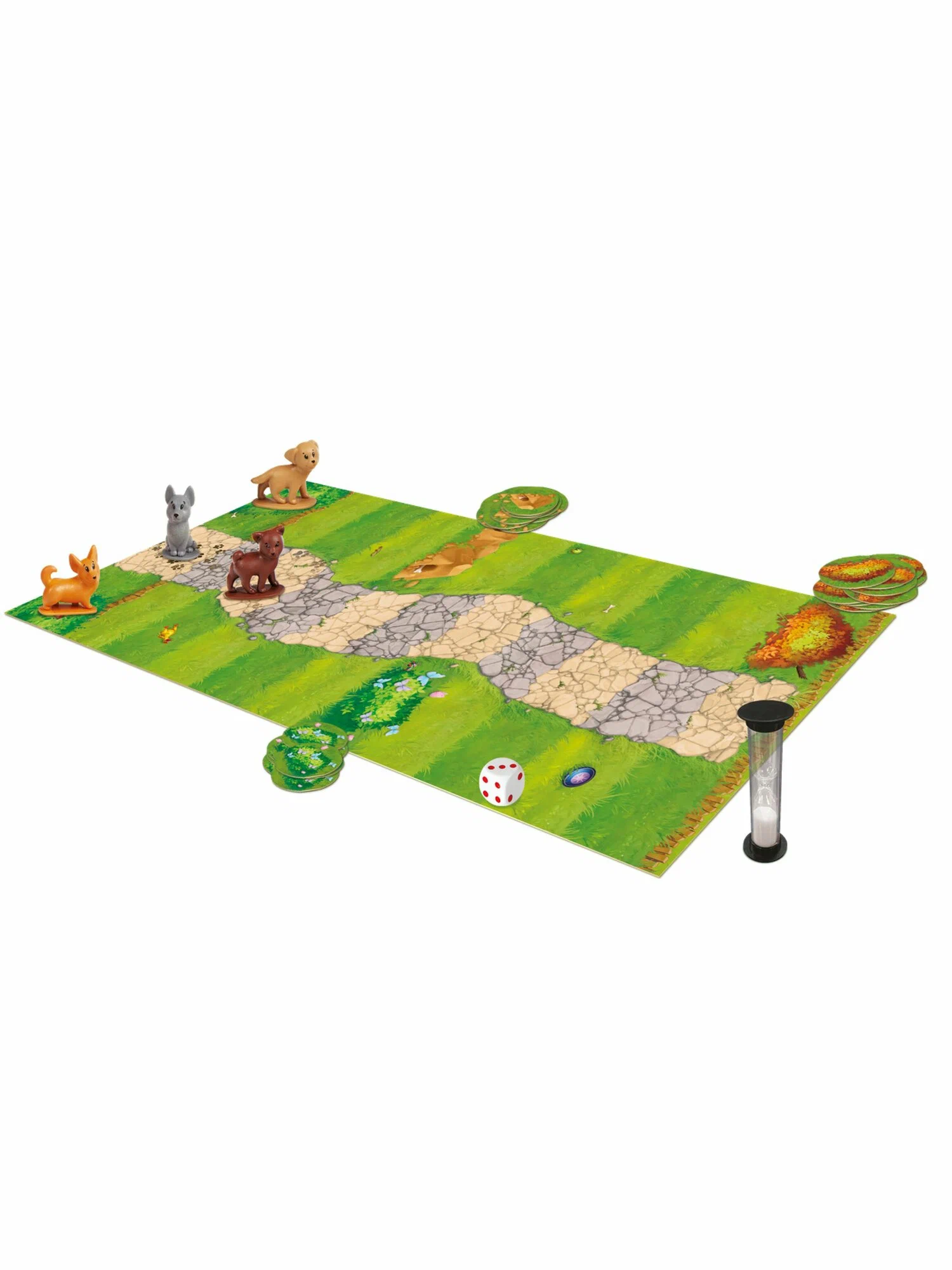 Механика строится вокруг коротких, очень насыщенных ходов. Активный игрок переворачивает песочные часы — это даёт ровно одну минуту на весь ход. Затем он бросает кубик и перемещает свою фигурку собачки по дорожкам парка на выпавшее количество шагов, выбирая путь к ближайшему или более далёкому месту для копания. Чем дальше от старта вы уйдёте, тем ценнее могут оказаться жетоны, но тем больше риск не успеть вернуться вовремя.