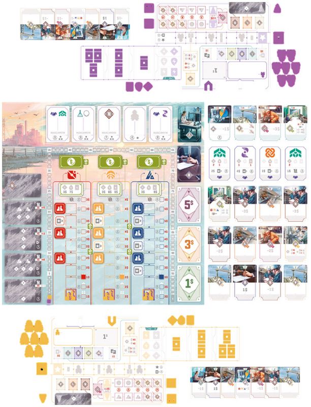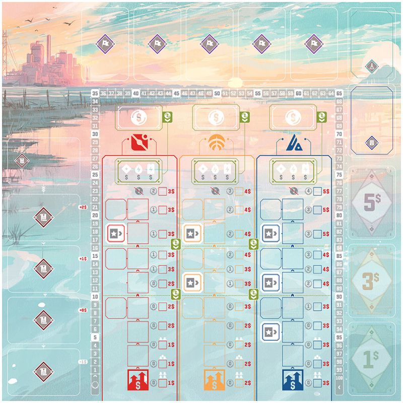 На общем поле располагаются: рынок участков, треки стоимости трёх компаний, слоты для общих целей и несколько рядов карт. В открытой выкладке доступны усовершенствования, контракты и карты денег с печатными действиями на обратной стороне. В конце раунда ряды частично обновляются, поэтому окно возможностей постоянно смещается, а доступ к нужным картам становится предметом борьбы между игроками.