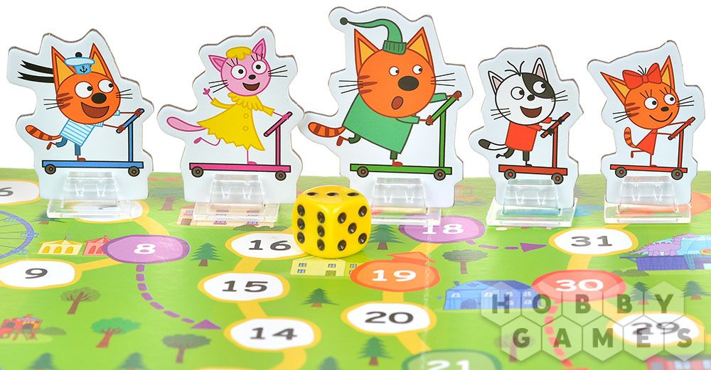 На одной клетке может стоять только одна фишка, поэтому ситуация на поле постоянно меняется. Если по результатам хода котёнок должен попасть на занятую клетку, правила предусматривают обход или перепрыгивание, что создаёт дополнительную динамику и учит детей планировать хотя бы на один ход вперёд. При этом все решения остаются простыми и визуально понятными, так что даже самые маленькие участники быстро включаются в процесс.