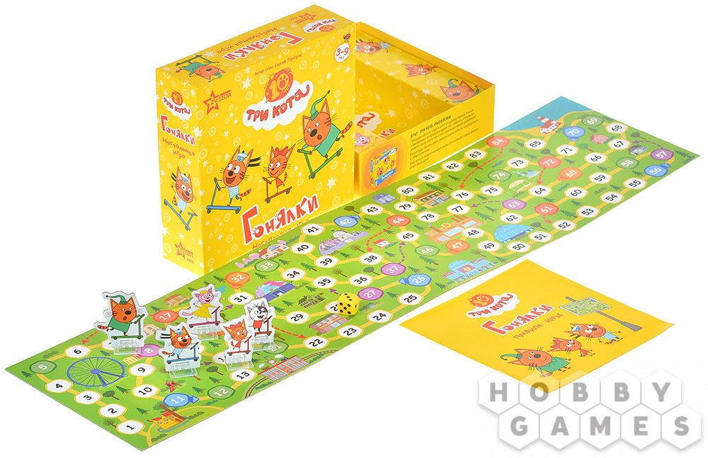 «Три кота: Гонялки» — простая и яркая детская настольная игра‑гонка по мотивам популярного мультсериала о котятах Коржике, Компоте и Карамельке. Игроки отправляются в весёлое путешествие от домика до маяка, соревнуясь, чей котёнок доберётся до моря первым, а по пути используют специальные клетки‑«гонялки», чтобы обгонять соперников и устраивать забавные манёвры.