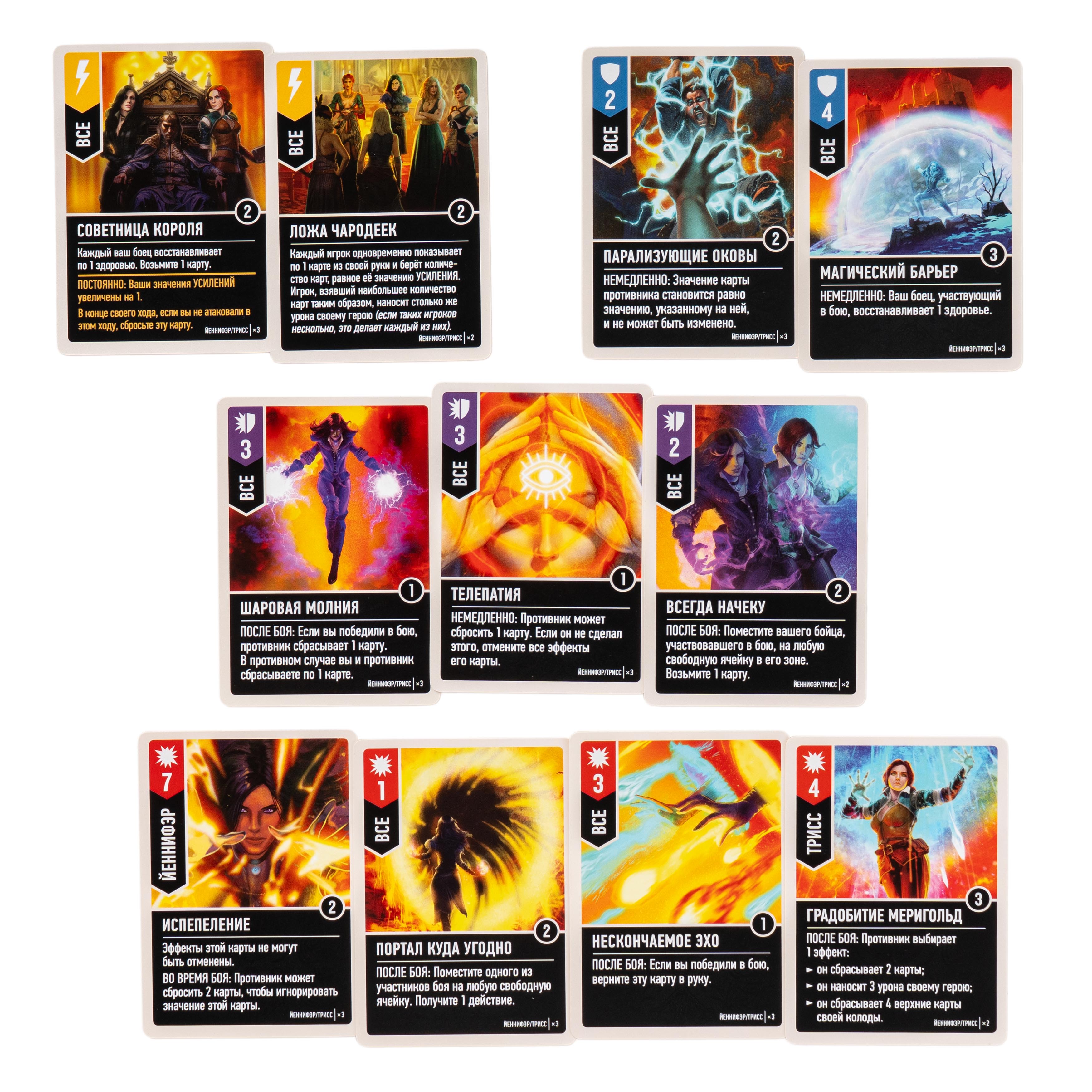 Трисс и Йеннифэр — единый колдовской дуэт. В начале партии вы решаете, кто будет героем, а кто — помощником. У них общая колода, но разные стили: Йеннифэр полагается на неотменяемые усиления, а Трисс заставляет врага выбирать между губительными эффектами и наносит урон даже соседям. Их постоянный приём увеличивает силу усилений, но обязывает атаковать каждый ход.