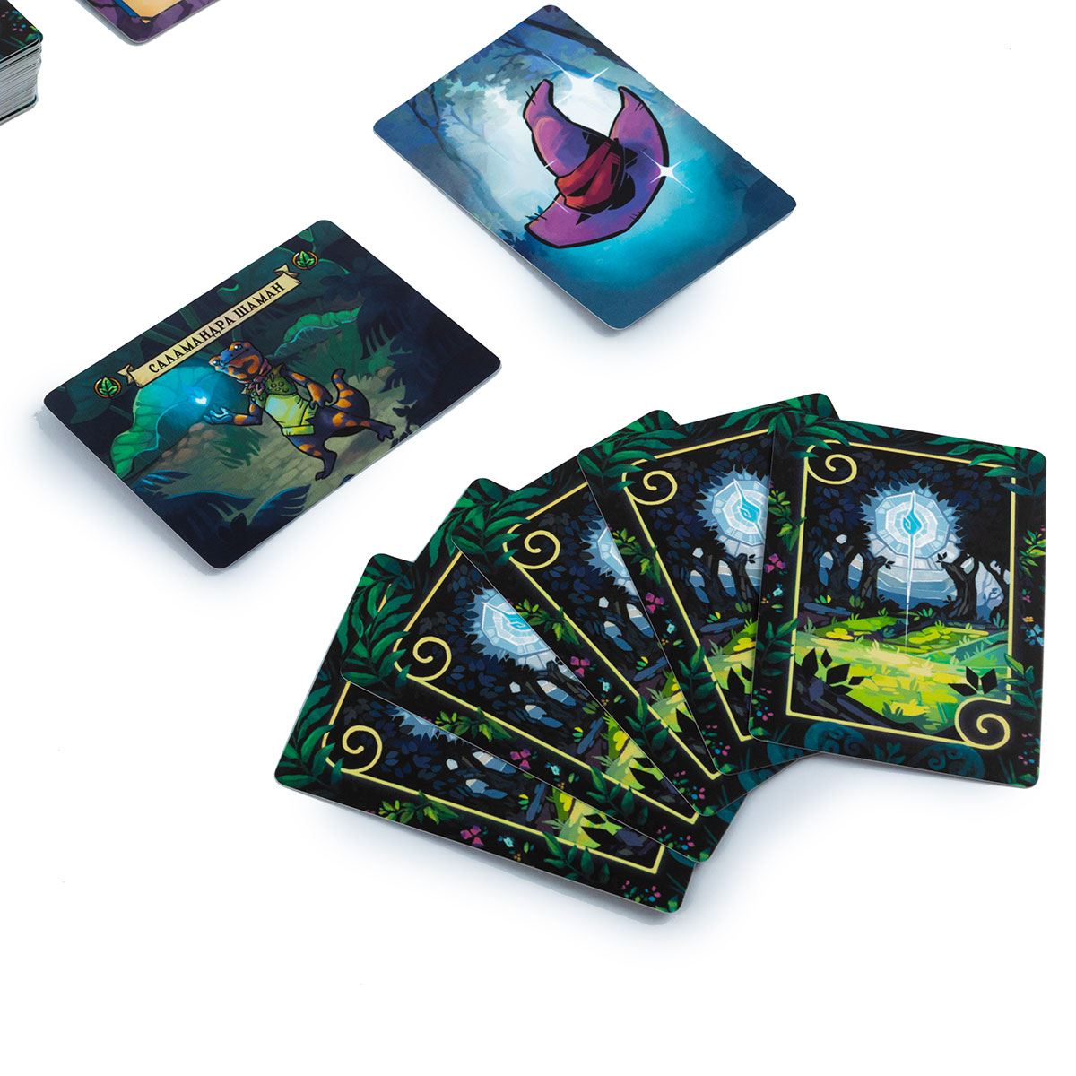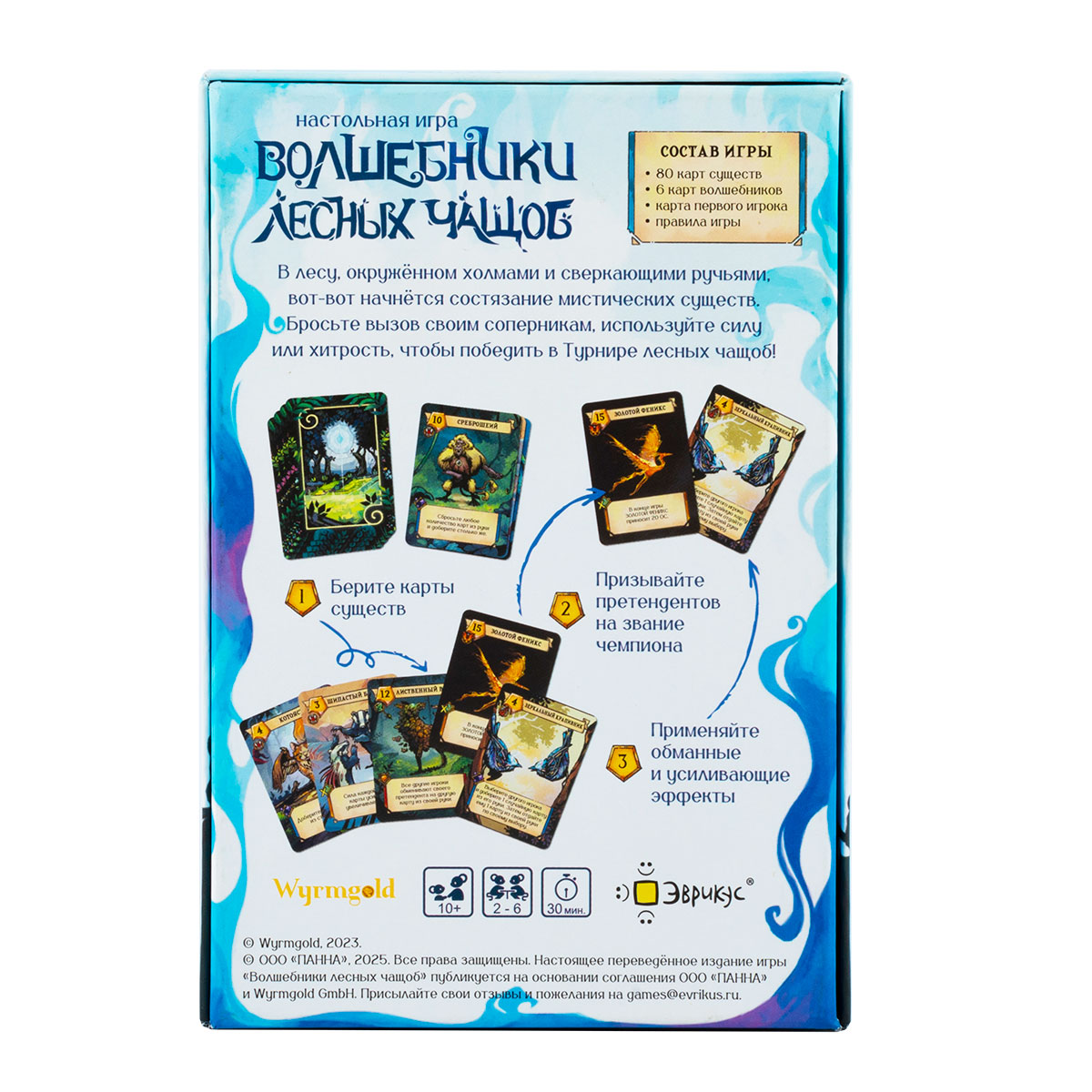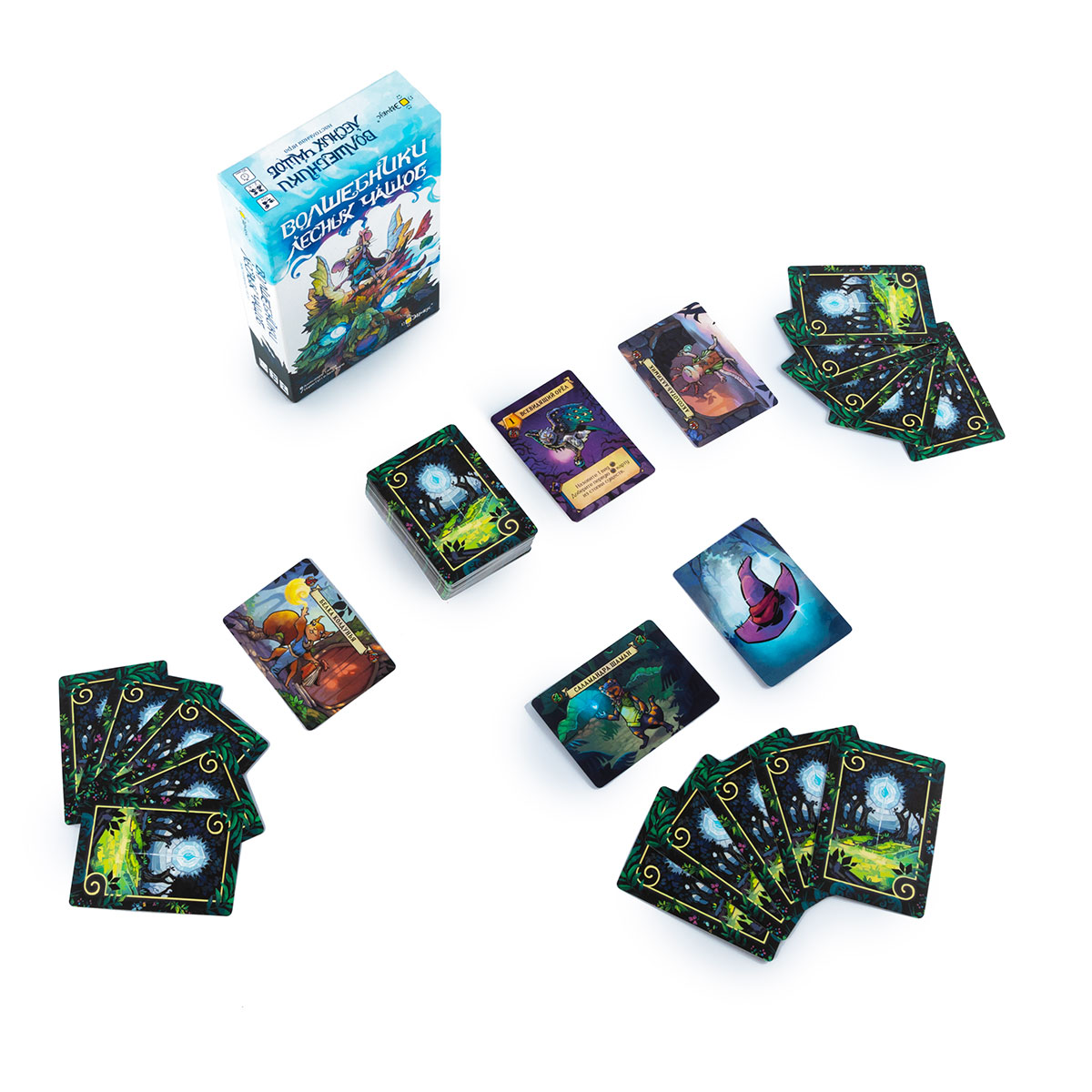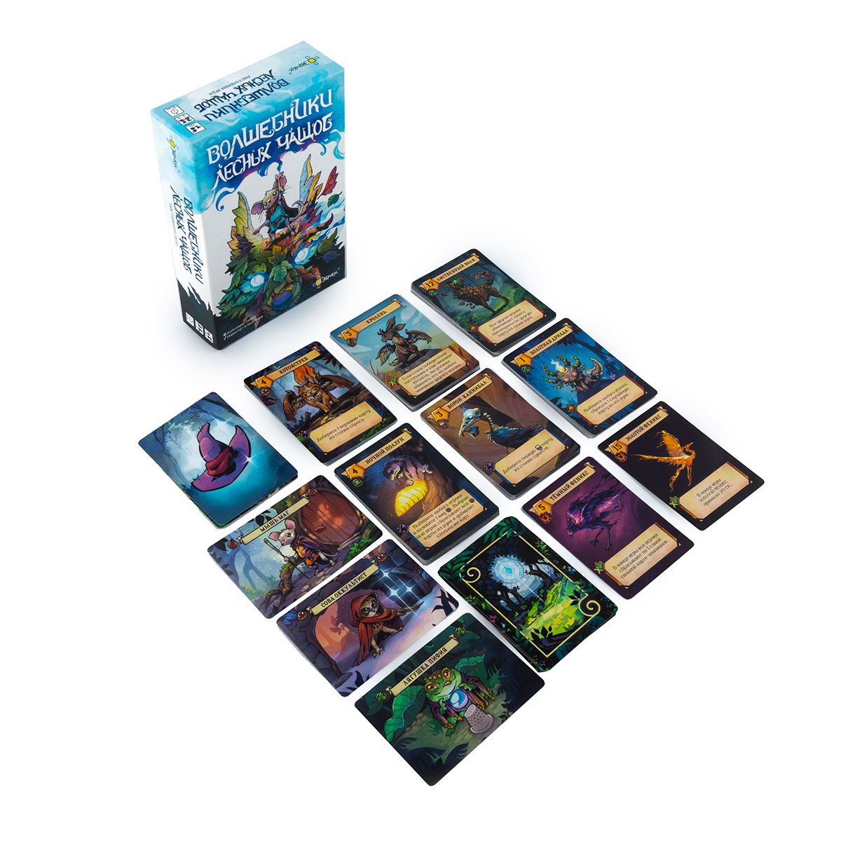 Основой игры служит крупная колода существ. Внутри неё встречаются духи леса, хищные обитатели чащоб и другие фантастические персонажи, каждый со своим значением силы и особым эффектом. Участники также получают карты волшебников – это персонажи игроков, задающие общий визуальный образ и рамку партии. Игра рассчитана на 2–6 человек, а при наличии двух коробок можно организовать большой турнир до 12 участников, разделив игроков на столы.