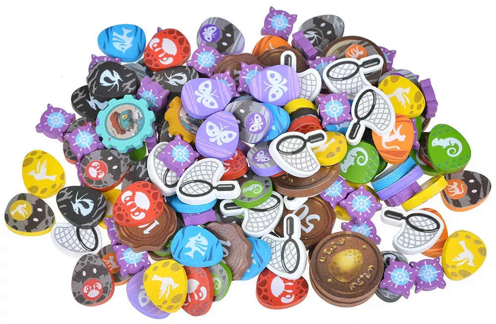 Авторы базовой игры специально выпустили отдельную коробочку, в которой соединились польза и эстетика. Все ключевые служебные элементы заменены более прочными и приятными на ощупь аналогами: теперь за каждое найденное яйцо, пойманное существо или выполненную цель отвечает не тонкий картон, а плотное дерево с сочной печатью. Металлические кубки‑призы выглядят как настоящие трофеи и сразу притягивают взгляд на столе, подчёркивая важные достижения в партии.