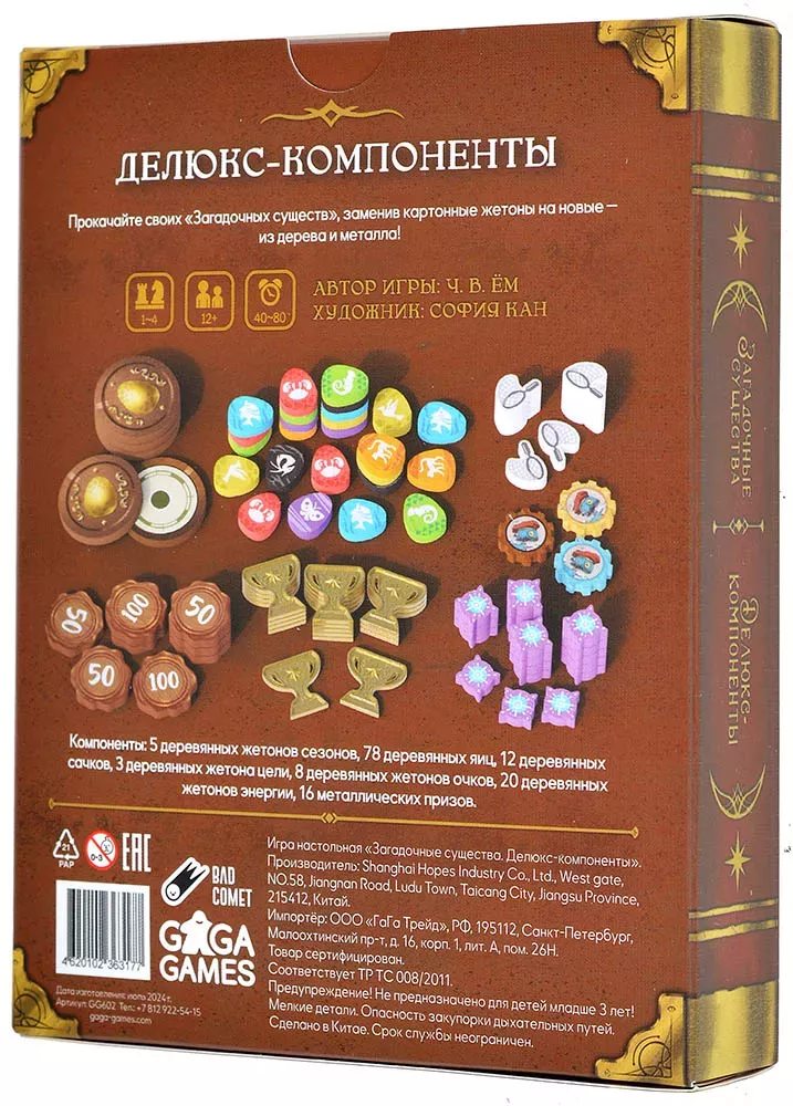 Коробка оформлена в том же стиле, что и другие дополнения к «Загадочным Существам», и выполнена в формате аккуратной «книжки». Такой форм‑фактор удобно хранить рядом с базовой игрой и другими расширениями серии, а внутри всё разложено компактно и аккуратно. Это не самостоятельная игра, а именно аксессуар‑апгрейд: чтобы использовать делюкс‑компоненты, вам понадобится базовый набор «Загадочные Существа».